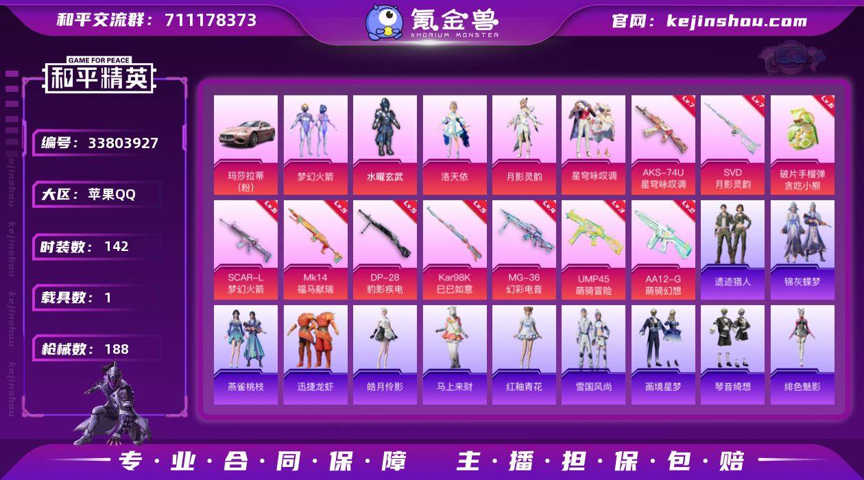 【10粉枪5粉装 梦幻火箭 玛莎拉蒂Ghibli(粉)】苹果 手Q-5粉装-10特效枪-1载具-1粉色飞行器-60074热力值-9王牌印记-142套装-188枪皮 【热门品类】:粉装-梦幻火箭,套装-小丑鱼,套装-SS1特训,套装-龟仙人 【粉色套装】:粉装-水曜玄武,粉装-梦幻火箭,角色-洛天依,角色-月影灵韵,粉装-星穹咏叹调 【粉色枪皮等级】:SCAR-L-梦幻火箭(六级),UMP45-萌骑冒险(三级),AKS-74U-星穹咏叹调(七级),Kar98K-巳巳如意(五级),Mk14-福马献瑞(五级),SVD-月影灵韵(七级),AA12-G-萌骑幻想(二级),DP-28-豹影疾电(五级),MG-36-幻彩电音(四级),破片手榴弹-贪吃小熊(六级) 【粉色载具】:玛莎拉蒂Ghibli(粉) 【粉色枪皮】:SCAR-L-梦幻火箭,UMP45-萌骑冒险,AKS-74U-星穹咏叹调,Kar98K-巳巳如意,Mk14-福马献瑞,SVD-月影灵韵,AA12-G-萌骑幻想,DP-28-豹影疾电,MG-36-幻彩电音,破片手榴弹-贪吃小熊 【粉色飞行器】:梦幻火箭飞行器 【粉色降落伞】:梦幻火箭降落伞,天启纪元降落伞,洛神天依降落伞,月影灵韵降落伞,鬼刀降落伞,星穹咏叹调降落伞,无垠阁降落伞,炫彩糖果降落伞,霜月狼主降落伞,诸神·破晓降落伞 【稀有套装】:套装-龟仙人,套装-巳巳如意,套装-雪国风...