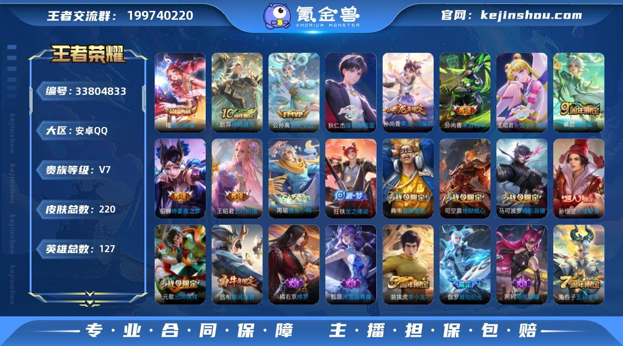 实名: 可修改 贵族等级: V7 英雄数: 127 皮肤数: 220 荣耀水晶: 拾光映像 传说皮: 末日机甲-孙尚香,仲夏夜之梦,乞巧织情,永恒水手月亮,夜礼服假面,乘龙·问璇玑,云诺千山,神树通天 限定皮: 李小龙,游园惊梦,梁祝,御风骁将,大圣娶亲,霸王别姬-虞姬,五谷丰年,鸣野蒿