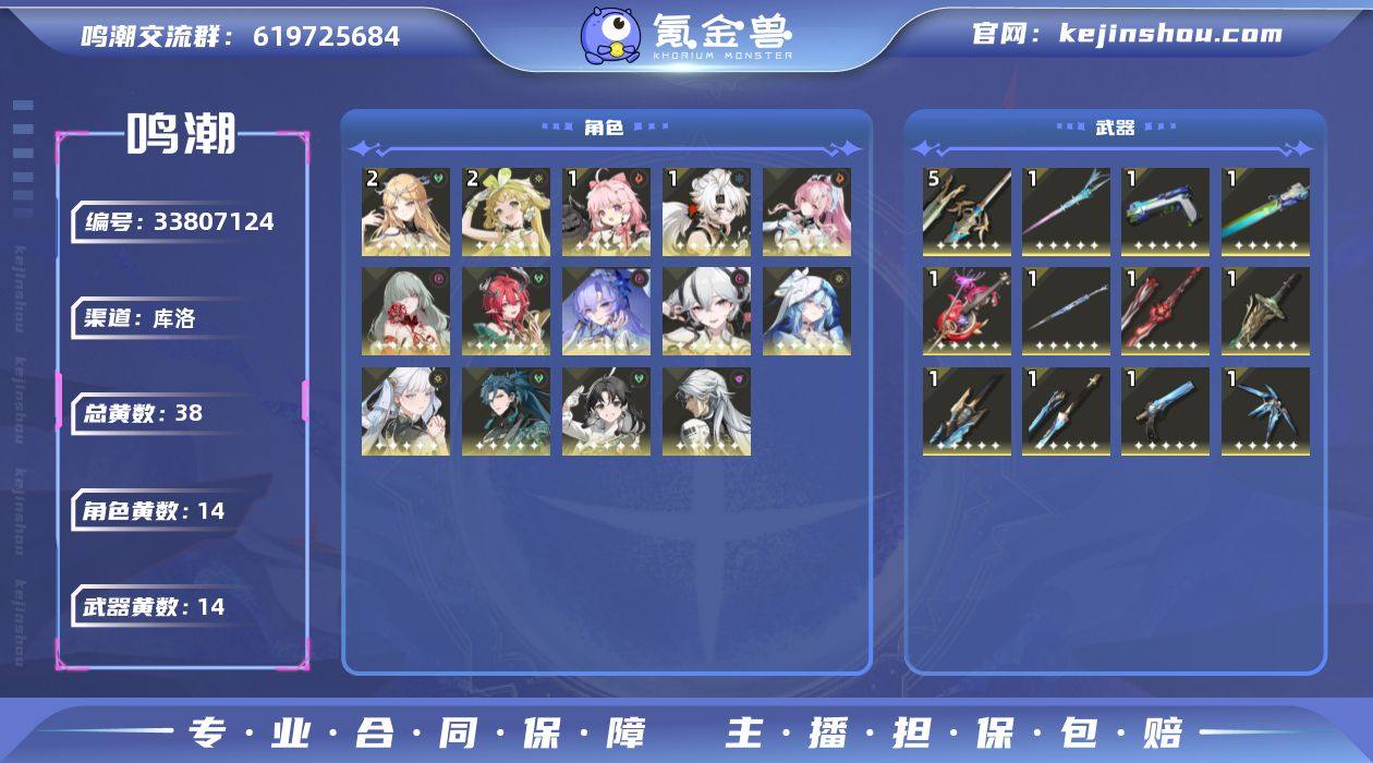 男/女主: 男主 总黄数: 38 联觉等级: 74 拥有五星共鸣者: 忌炎,鉴心,卡卡罗,安可,维里奈,凌阳,今汐,守岸人,椿,坎特蕾拉,夏空,卡提希娅,弗洛洛,爱弥斯 2鸣五星共鸣者: 2鸣维里奈,2鸣卡提希娅 1鸣五星共鸣者: 1鸣安可,1鸣凌阳 0鸣五星共鸣者: 0鸣忌炎,0鸣鉴心,0鸣卡卡罗,0鸣今汐,0鸣守岸人,0鸣椿,0鸣坎特蕾拉,0鸣夏空,0鸣弗洛洛,0鸣爱弥斯 拥有五星武器: 苍鳞千嶂,浩境粼光,千古洑流,停驻之烟,漪澜浮录,裁春,血誓盟约,不屈命定之冠,幽冥的忘忧章,源能机锋,相位涟漪,永远的启明星 5鸣五星武器: 5鸣血誓盟约 1鸣五星武器: 1鸣苍鳞千嶂,1鸣浩境粼光,1鸣千古洑流,1鸣停驻之烟,1鸣漪澜浮录,1鸣裁春,1鸣不屈命定之冠,1鸣幽冥的忘忧章,1鸣相位涟漪,1鸣源能机锋,1鸣永远的启明星 亮点: 【MC359】74级/38黄/男主/14个五星角色/14个五星武器未绑定,爱弥斯,夏空,卡提希娅,弗洛洛,坎特蕾拉,椿,今汐,守岸人,忌炎,维里奈,卡卡罗,鉴心,安可,凌阳,永远的启明星,相位涟漪,源能机锋,幽冥的忘忧章,不屈命定之冠,血誓盟约,裁春,苍鳞千嶂,浩境粼光,千古洑流,停驻之烟,漪澜浮录,2命卡提希娅,2命维里奈,1命安可,1命凌阳,0命爱弥斯,0命夏空,0命弗洛洛,0命坎特蕾拉,0命椿,0命今汐,0命守岸人,0命忌炎,0命卡...