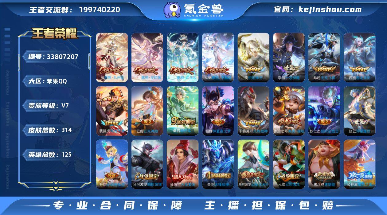 实名: 可修改 性别: 男号 贵族等级: V7 英雄数: 125 皮肤数: 314 传说皮: 久胜战神,炽阳神光,一念神魔,仲夏夜之梦,游龙清影,淬星耀世,超时空战士-狄仁杰,无双飞将,小动物乐团,幻光神枪,祥瑞亨通 限定皮: 冰锋战神,遇见飞天,李小龙,梁祝,御风骁将,天狼溯光者,蜜橘之夏,飞衡,天狼运算者,寅虎·御盾,大圣娶亲,寅虎·瑞焰,霸王别姬-项羽,高山流水,猪悟能,匿光追影者,寅虎·心曲,寅虎·展翼,匿光决锋者,五谷丰年,山海·玄木吟,鸣野蒿,愿照·千秋盛,愿照·众生和,愿照·岁时盈,愿照·九州拓 亮点: 【优质装备】:久胜战神,炽阳神光,一念神魔,仲夏夜之梦(大飞蛾),游龙清影(小青龙),淬星耀世,超时空战士-狄仁杰,无双飞将,小动物乐团