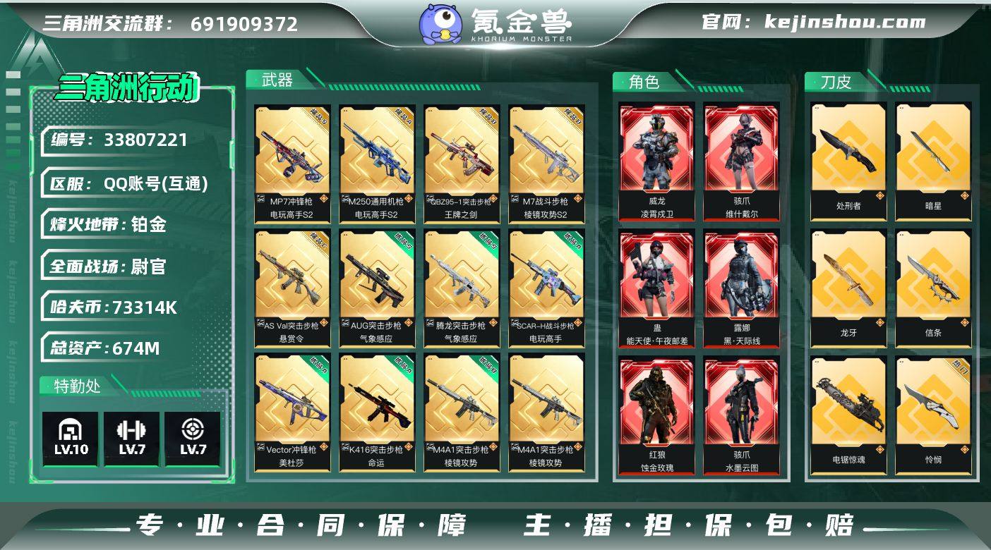 【PTSJZ4725】总资产674M/哈夫币7331万/传说枪皮数72/战场等级50/行动等级60/安全箱等时效性道具以游戏内数据为准,详情请看图/红狼-蚀金玫瑰/骇爪-水墨云图/露娜-黑·天际线/蛊-能天使·午夜邮差/骇爪-维什戴尔/威龙-凌霄戍卫/威龙-壮志凌云(S3)/蜂医-送葬人·无题密令(S5)/牧羊人-街头之王(S2)/无名-夜鹰(S4)/深蓝-不破誓约(S6)/红狼-电锯惊魂/乌鲁鲁-荒原猎手/蛊-不羁人生/近战-暗星/近战-北极星/近战-信条/近战-黑海/近战-影锋/近战-怜悯/近战-赤枭/近战-龙牙/近战-电锯惊魂/近战-处刑者/近战-处刑者2级/近战-处刑者3级/近战-处刑者4级/近战-黑鹰/M4A1突击步枪-棱镜攻势/SCAR-H战斗步枪-电玩高手/Vector冲锋枪-美杜莎/QBZ95-1突击步枪-王牌之剑/K416突击步枪-命运/AUG突击步枪-气象感应/腾龙突击步枪-气象感应/M7战斗步枪-棱镜攻势S2/AS Val突击步枪-悬赏令/M250通用机枪-电玩高手S2/MP7冲锋枪-电玩高手S2/优品B典藏武器外观-M4A1突击步枪-棱镜攻势/优品A典藏武器外观-SCAR-H战斗步枪-电玩高手/优品A典藏武器外观-Vector冲锋枪-美杜莎/极品B典藏武器外观-QBZ95-1突击步枪-王牌之剑/优品A典藏武器外观-K416突击步枪-命运/优品S典藏武器外观-AUG突击步枪-气象感应/优品S典藏武...