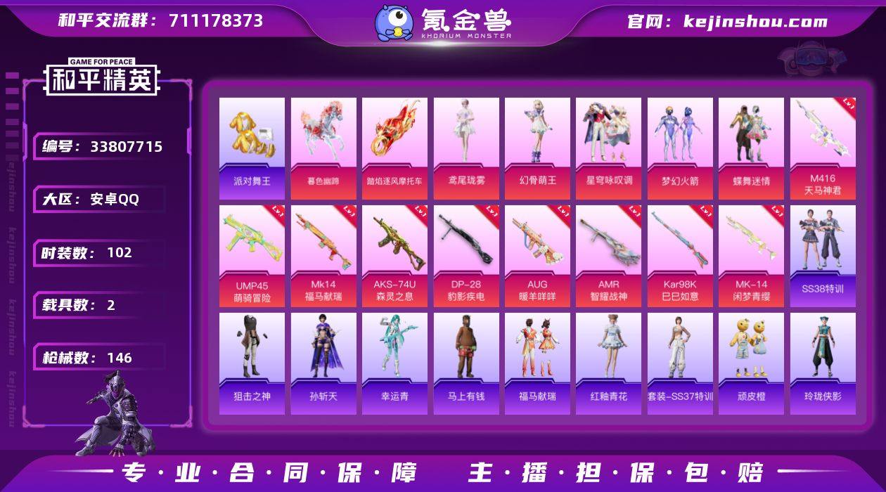 【女号金鞋9特效枪5粉装2载具 秒换绑不用等】 安卓Q区-48183热力值-102套装-146枪皮 【2载具】 暮色幽蹄 踏焰逐风摩托车【1稀有】 派对舞王(金靴子)【5粉装】 梦幻火箭 蝶舞迷情 鸢尾珑雾 幻骨萌王 星穹咏叹调【9特效枪】 AKS-74U-森灵之息(5级) Mk14-福马献瑞(1级) UMP45-萌骑冒险(5级) M416-天马神君(3级) Mk14-闲梦青缨(6级) AMR-智耀战神(7级) Kar98K-巳巳如意(5级) AUG-暖羊咩咩(5级) DP-28-豹影疾电(5级)【144热门】 小丑鱼 迅捷狂鲨 白色伏地魔 SS26特训 SS25特训 SS24特训 M249-彩虹符号 MG3-幻世战舞者 AKM-虎虎生威 呆萌铁蟹 鹰眼刺客 M762-第五大道 破蛋小黄鸡 长空猛禽 青涩时光 魅力单车 猎鹰 坚韧舞者 黑色伏地魔 汤姆逊-智耀战神 AA12-G-雨过天青 沙漠之鹰-雨过天青 蓝调潮影 平底锅-画境星梦 P90-紫矿核心 暗夜风云 玲珑侠影 M16A4-雨过天青 AC-VAL-荒原烈焰 雨过天青 冰河战士 燃点复合弓-火尖莲影 破片手榴弹-火尖莲影 MG-36-薄荷星砂 GROZA-福马献瑞 恋语绒绒 撬棍-火尖枪 SS34特训 玩偶服-美羊羊 漫游都市 朱霞炽焰 SS12特训 福马献瑞 大橘大利 霜刃之御 SS17特训 燃点复合弓-罪夜之冕 凌霄紫焰 龙魂突击队 SS29特训 SS30特训 ACE32-冰晶雪宝 擎苍青焰...