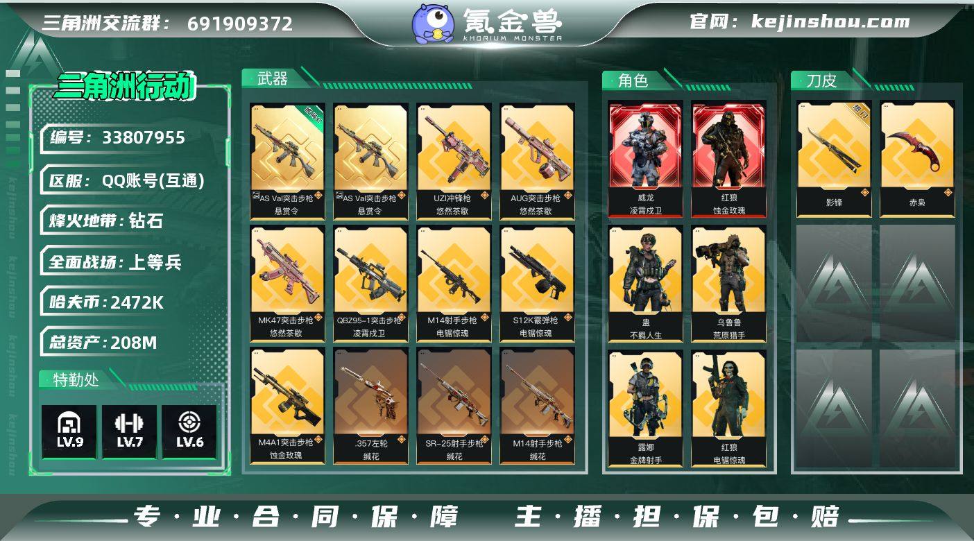 QQM99/包人脸/QQ区【高资产208M+2刀2红皮7金皮+巨浪砖皮+满体6负重精品跑刀猛攻号】【总资产208M:+近战赤霄+影锋+红皮蚀金玫瑰+凌霄戍卫】【ASVal突击步枪 悬赏令 优品C】【红狼-电锯惊魂+威龙-壮志凌云+无名-夜鹰+蜂医-无题密令+蛊-不羁人生+乌鲁鲁-荒原猎手+露娜-金牌射手】/烽火等级:60/全面战场:13/纯币:2475k三角券加币:113(57三角币+56三角券)//部门:23322/特勤等级(技术中心3级/工作台3级/制药台3级/防具台3级/仓库9级/指挥中心5级/训练中心7级/靶场6级/潜水中心1级/收藏室1级)---影锋捆绑包---/橙色挂饰x8/流动资产:164M段位:钻石二/详细看图