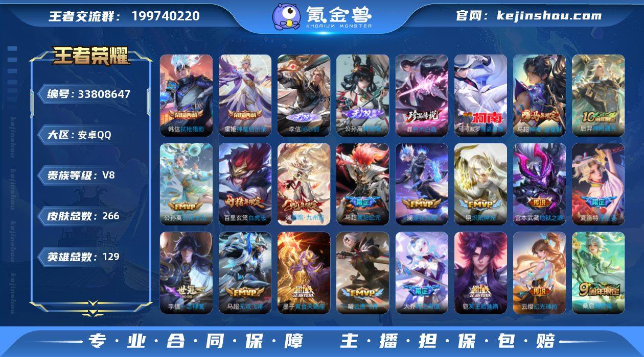 安卓Q-V8-至尊星耀I段位-129英雄-266皮肤-2典藏皮肤-2无双-2珍品传说-24传说-83史诗 【英雄全皮】:孙权全皮,敖隐全皮,澜全皮,影全皮 【荣耀典藏】:韩信弑枪猎影,虞姬神鉴启示录 【无双皮肤】:李信问心剑,公孙离离恨烟 【珍品传说】:暃朽木白哉,马可波罗怪盗基德 【传说皮肤】:马超神骥逐星野,后羿神树通天,公孙离云诺千山,澜愿照九州拓,云缨幻光神枪,桑启鸣野蒿,铠冥王哈迪斯,墨子黄金天蝎座,马超琥珀纪元,澜逐花归海,大乔时之奇旅,东皇太一灼幽烈阳,澜电玩雷克斯,夏洛特浮生妄,马超无双飞将,镜炽阳神光,虞姬启明星使,曜云鹰飞将,李信一念神魔,干将莫邪久胜战神,百里玄策白虎志,花木兰冠军飞将,梦奇胖达荣荣,宫本武藏地狱之眼 【限定皮肤】:公孙离离恨烟,铠冥王哈迪斯,蒙犽顽岩魄,蔡文姬夏日便利店,大乔绒语心约,虞姬夏日便利店,姜子牙天穹之誓,杨戬破阵退雄兵,狄仁杰阴阳师,赵云皇家上将,阿轲迷踪丽影,钟无艳超时空战士,元歌无心,甄姬落雪兰心,马可波罗暗影游猎,狄仁杰魔术师,狄仁杰万华元夜,达摩沙漠行僧,项羽海滩派对,兰陵王金庭之子,孙悟空孙行者,李元芳云中旅人,虞姬启明星使,钟馗驱傩正仪,杨戬潮玩骑兵,鬼...