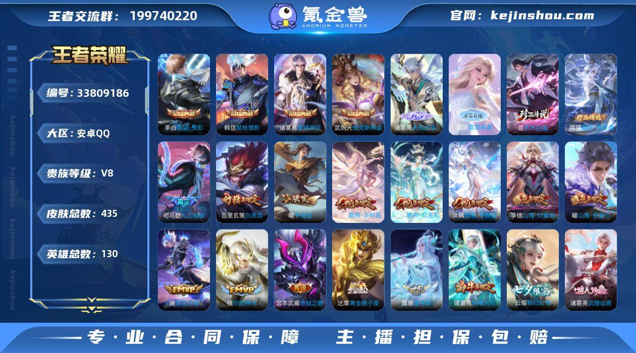 贵族等级8/荣耀典藏数量4/传说皮肤数量31/史诗皮肤数量142/皮肤数量435/英雄数量130/段位最强王者/金标狄仁杰/金标武则天/金标元流之子(射手)/金标曹操/金标云缨/司马懿全皮/孙权全皮/诸葛亮全皮/敖隐全皮/蒙恬全皮/暃全皮/赵怀真全皮/空空儿全皮/影全皮/武则天/倪克斯神谕/鸣剑·曳影/星域神启/弑枪猎影/天机白泽/雪境奇遇-甄姬/朽木白哉/器灵·落星盏/云缨神骥越千峰/狄仁杰神骥赴朔漠/九山相柳/愿照·千秋盛/愿照·众生和/愿照·岁时盈/鸣野蒿/澜逐花归海/霜月吟/鹤归松栖(云缨)/鹤羽星尊/山海·琳琅生/山海·苍雷引/山海·炽霜斩/诗剑行/异界灵契/李逍遥/飞鸢探春/时雨天司/炽阳神光/启明星使/云鹰飞将/久胜战神/黄金狮子座/白虎志/胖达荣荣/武陵仙君/仲夏夜之梦/地狱之眼/地狱火/海洋之心/埋骨钱/蒙犽顽岩魄/蔡文姬夏日便利店/虞姬夏日便利店/天穹之誓(s36)/阴阳师/皇家上将/百木心枪/神迹守卫-墨子/时之奇旅-妲己/蔷薇恋人/狮舞东方/高山流水/王者之锤/夜都怪侠/重明(s11)/幻夜卜梦/猎兽之王/御风骁将/赤莲之焰/云间偶戏/无心/朔风刀(s17)/游园惊梦/烛龙(s10)/穷奇(s12)/蓝屏警告/暗影游猎/山海·玄木吟/魔术师/万华元夜(s22)/星际陆战队-达摩/沙漠行僧(s26)/海滩派对/醍醐杖(s20...
