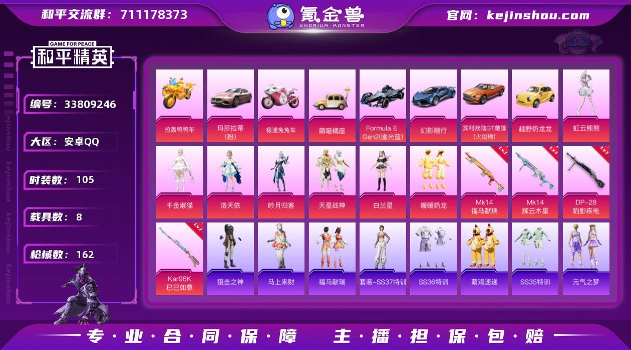 可二次【9载具7粉装4特效枪 秒换绑不用等】 安卓Q区-57327热力值-105套装-162枪皮 【9载具】 玛莎拉蒂Ghibli(粉) 萌喵橘座 Formula E Gen2(幽光蓝) 幻影随行 宾利欧陆GT敞篷(火焰橘) 拉轰鸭鸭车 极速兔兔车 僚机-萌兔起飞 越野奶龙龙【7粉装】 洛天依 虹云熊熊 暖暖奶龙 白兰星 吟月归客 天星战神 角色-千金淑猫【4特效枪】 Mk14-福马献瑞(1级) Mk14-辉云木星(1级) Kar98K-巳巳如意(5级) DP-28-豹影疾电(5级)【143热门】 SS27特训 SS26特训 SS25特训 SS24特训 SS23特训 SS22特训 SCAR-L-玉兔迎春 GROZA-田园牧歌 M762-天降萌叽 Mk47-乌木金纹 UZI-娇憨猪猪 DBS-彩虹符号 M249-彩虹符号 MG3-幻世战舞者 M416-蓝色火焰 长空猛禽 甜蜜熊情侣 牛气冲天 妙红点点 懵萌河马 魅力单车 坚韧舞者 黑色伏地魔 海岛探路者 纯真浪花 S1897-糯团青竹 MK20-H-樱桃泡泡 冰河战士 雏菊兔兔 MG-36-薄荷星砂 GROZA-福马献瑞 恋语绒绒 SS34特训 玩偶服-美羊羊 漫游都市 星渊小夜曲 AWM-天降萌叽 福马献瑞 大橘大利 战术弩-江南烟雨 SS20特训 SS21特训 龙魂突击队 SS29特训 萝兰蝴蝶 SS30特训 ACE32-冰晶雪宝 青团波波 鱼渊荷华 大砍刀-鬼刀 SS28特训 PKM-啾咪啾咪 海盐绵绵冰 M16A4-冰河战士 燕燕...