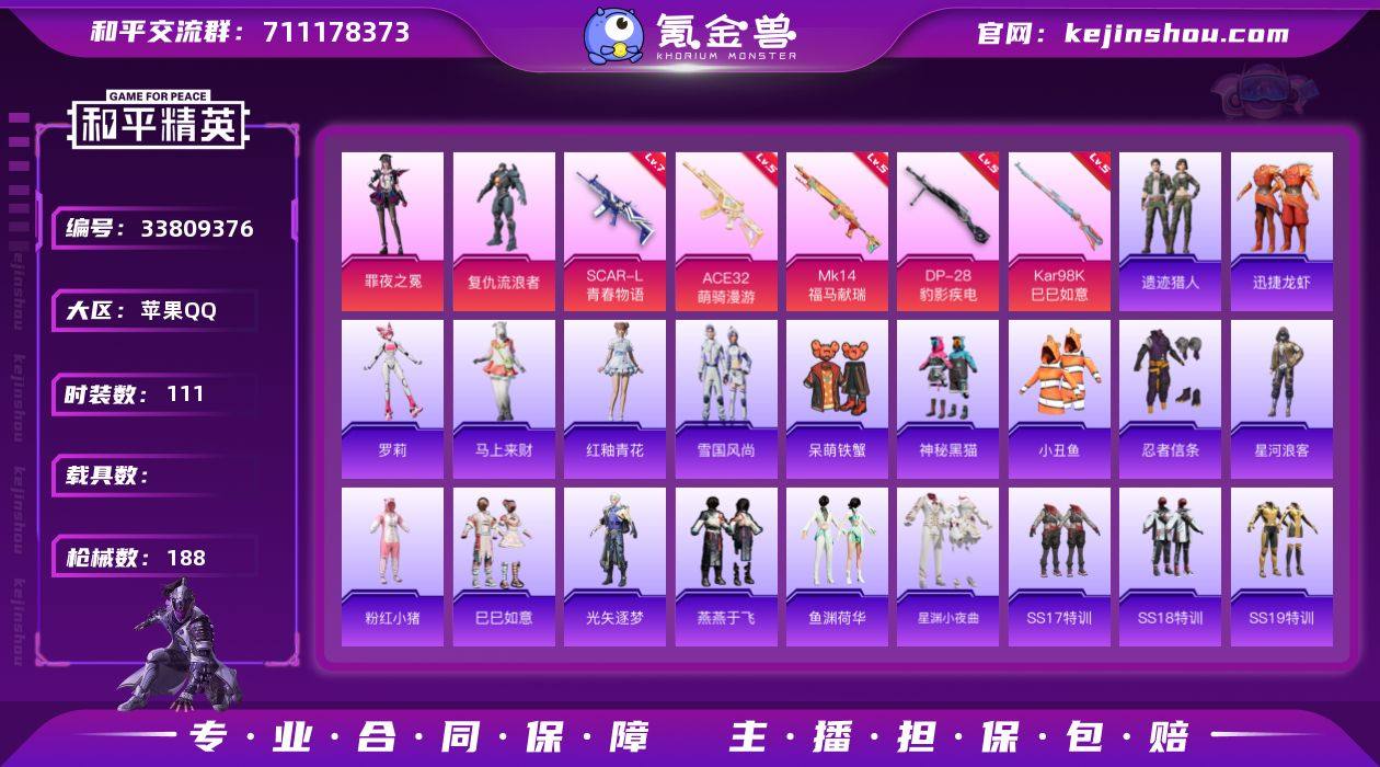 无二次【巡查资格】苹果手Q-2粉装-5特效枪-2粉色飞行器-49805热力值-8王牌印记-111套装-188枪皮 【热门品类】:套装-小丑鱼,套装-忍者信条,套装-星河浪客,套装-粉红小猪 【粉色套装】:角色-复仇流浪者,角色-罪夜之冕 【粉色枪皮等级】:SCAR-L-青春物语(七级),ACE32-萌骑漫游(五级),Kar98K-巳巳如意(五级),Mk14-福马献瑞(五级),DP-28-豹影疾电(五级) 【粉色枪皮】:SCAR-L-青春物语,ACE32-萌骑漫游,Kar98K-巳巳如意,Mk14-福马献瑞,DP-28-豹影疾电 【粉色飞行器】:炫彩糖果飞行器,彩虹独角兽飞行器 【粉色降落伞】:绝对恒星降落伞,神秘黑猫降落伞,星之彼岸降落伞,橘柚倾心降落伞,鬼刀降落伞,炫彩糖果降落伞,鸢尾珑雾降落伞 【稀有套装】:套装-巳巳如意,套装-雪国风尚,套装-炫彩糖果,角色-罗莉,套装-马上来财,套装-迅捷龙虾,套装-遗迹猎人,角色-光矢逐梦,套装-燕燕于飞,套装-鱼渊荷华,套装-星渊小夜曲,套装-雨过天青,套装-红釉青花 【稀有枪皮】:AUG-冰晶雪宝,AKM-夜灯,AKM-彩虹符号,AKM-缤纷海域,AKM-虎虎生威,AKM-霓虹街区,AKM-龙的传人,M16A4-幻世战舞者,M16A4-甜心亚梦,SCAR-L-玉兔迎春,SCAR-L-红色方程式,M416-夜灯,M416-...
