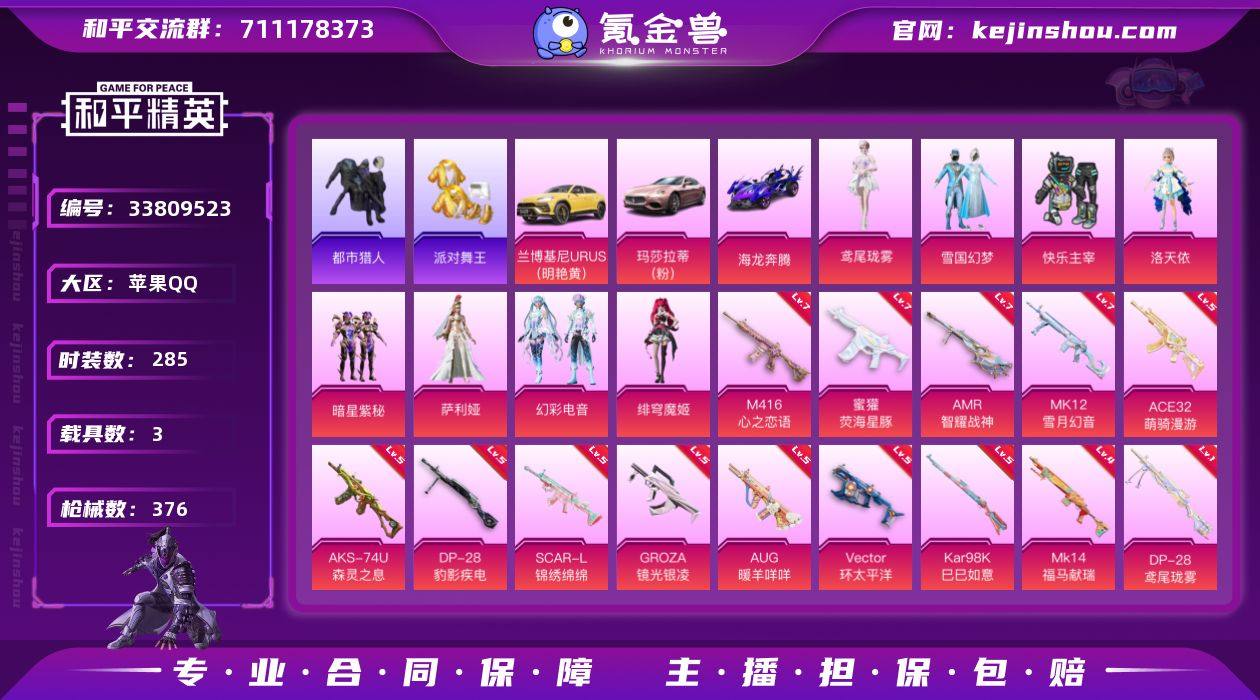 【kyhp2217】苹果手Q-8粉装-14特效枪-3载具-4粉色飞行器-118417热力值-22王牌印记-285套装-376枪皮 【热门品类】:粉装-雪国幻梦,套装-浪漫天命,套装-都市猎人,套装-派对舞王,套装-小丑鱼,角色-军刀雅典娜,套装-龟仙人,套装-暗影哥特,套装-浪漫波比,熔岩游骑兵连帽夹克 【粉色套装】:粉装-快乐主宰,粉装-雪国幻梦,角色-洛天依,粉装-暗星紫秘,角色-萨利娅,粉装-幻彩电音,角色-绯穹魔姬,角色-鸢尾珑雾 【粉色枪皮等级】:SCAR-L-锦绣绵绵(五级),M416-心之恋语(七级),GROZA-镜光银凌(五级),AUG-暖羊咩咩(五级),蜜獾-荧海星豚(七级),ACE32-萌骑漫游(五级),Vector-环太平洋(五级),AKS-74U-森灵之息(五级),Kar98K-巳巳如意(五级),Mk14-福马献瑞(四级),AMR-智耀战神(七级),MK12-雪月幻音(七级),DP-28-豹影疾电(五级),DP-28-鸢尾珑雾(一级) 【粉色载具】:兰博基尼URUS(明艳黄),玛莎拉蒂Ghibli(粉),海龙奔腾,空客H135-蔚蓝之翼 【粉色枪皮】:SCAR-L-锦绣绵绵,M416-心之恋语,GROZA-镜光银凌,AUG-暖羊咩咩,蜜獾-荧海星豚,ACE32-萌骑漫游,Vector-环太平洋,AKS-74U-森灵之息,Kar98K-巳巳如意,Mk14-福马献瑞,AMR-智耀战神,MK12-雪月幻音...