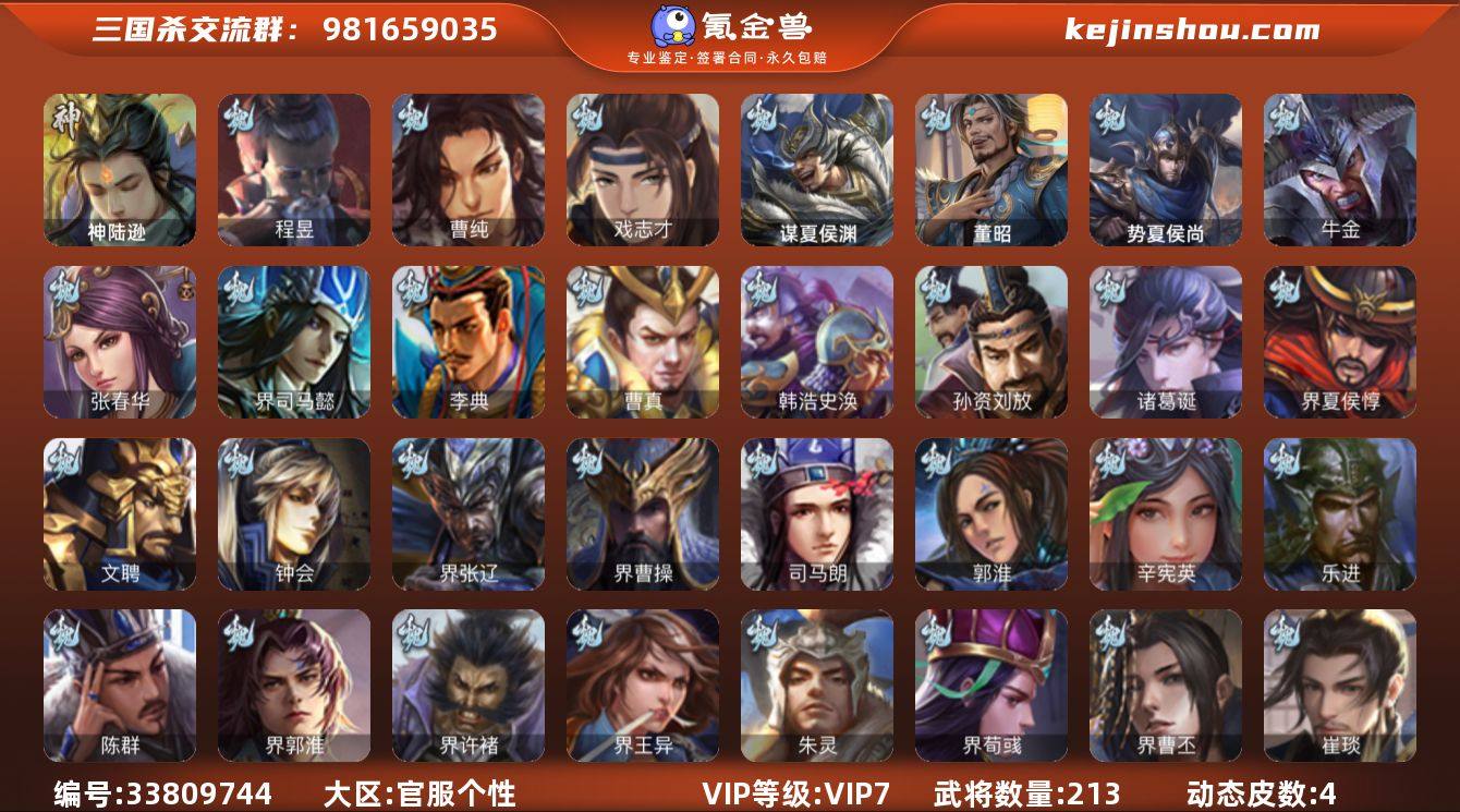 【14790378】官阶:领军将军;VIP等级:VIP7;史诗武将数量:10;动态皮肤数量:4;武将总数:213;史诗宝珠数量:0;将魂数量:4107;神将:1;魏国史诗武将:0;蜀国史诗武将:3;吴国史诗武将:2;群史诗武将:1