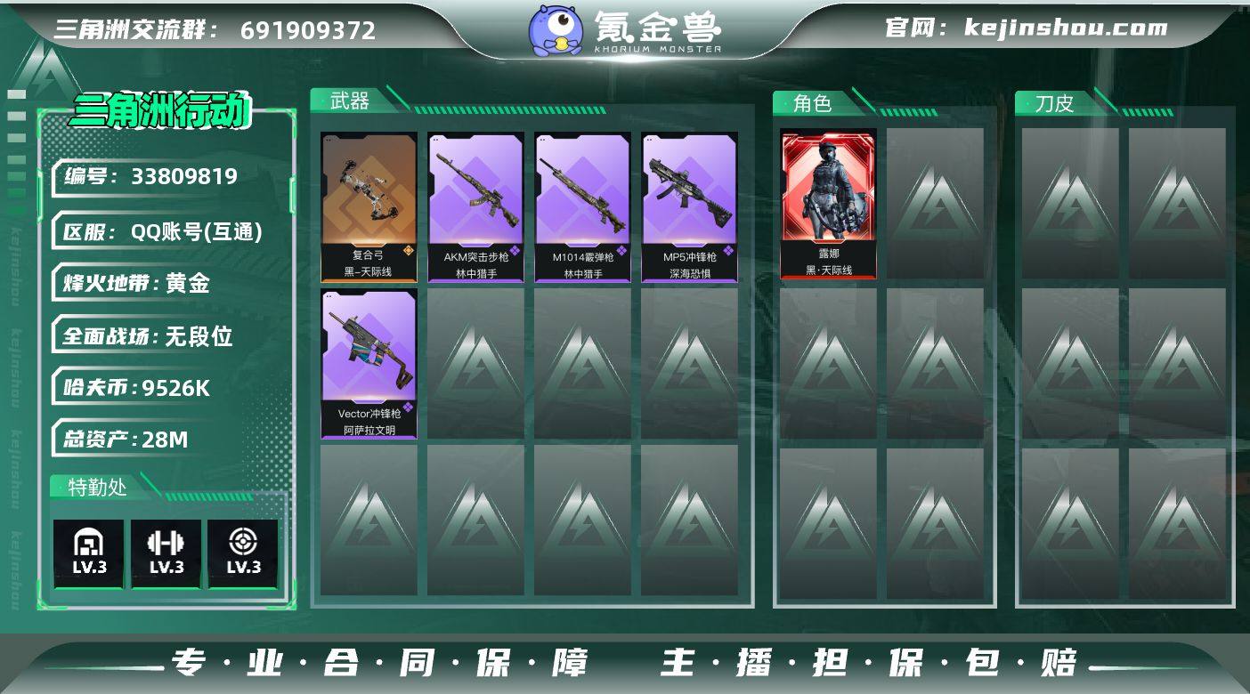【裸黑天际线.28M总资产.新手入坑首选】【Q区三端互通】【无二次协助处理】YXz8872-特勤处:仓库3级/靶场3级/训练中心3级-28m总资产-952w哈夫币-34烽火等级-黄金-1战场等级-无军衔 【干员外观】:露娜-黑·天际线 【近战皮肤】:近战-黑鹰 【传说外观】:复合弓-黑·天际线 【史诗外观】:AKM突击步枪-林中猎手,MP5冲锋枪-深海恐惧,Vector冲锋枪-阿萨拉文明,M1014霰弹枪-林中猎手 【稀有外观】:SCAR-H战斗步枪-荣耀列队,PTR-32突击步枪-天网,P90冲锋枪-浅鲨小队,Vector冲锋枪-先锋,SMG-45冲锋枪-哈夫克卫队,M250通用机枪-天网,Mini-14射手步枪-荣耀列队,SR-25射手步枪-开拓,SR-9射手步枪-街头涂鸦 【普通外观】:M4A1突击步枪-粉色涂装,M4A1突击步枪-高雅黑,M4A1突击步枪-海色,QBZ95-1突击步枪-高雅黑,QBZ95-1突击步枪-海色,AUG突击步枪-浅蓝涂装,M7战斗步枪-红色涂装,SG552突击步枪-浅蓝涂装,SG552突击步枪-海浪,SCAR-H战斗步枪-数码迷彩,MP5冲锋枪-海色,UZI冲锋枪-海色,QCQ171冲锋枪-三角洲力量,QJB201轻机枪-三角洲力量,SV-98狙击步枪-红色涂装,沙漠之鹰-海浪,M1911-坚固材料 【挂饰】:挂饰-黑,挂饰-阿萨拉狙击兵*2,挂饰-彩蛋,挂饰-阿萨拉徽...