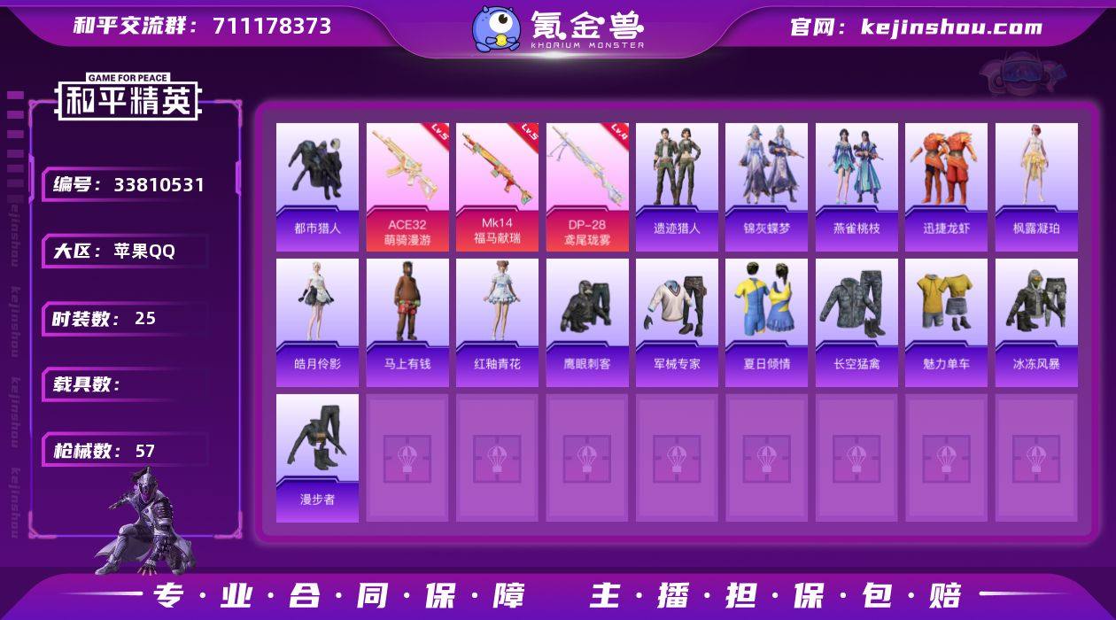 苹果手Q-3特效枪-1粉色飞行器-12647热力值-25套装-57枪皮 【热门品类】:套装-都市猎人 【粉色枪皮等级】:ACE32-萌骑漫游(五级),Mk14-福马献瑞(五级),DP-28-鸢尾珑雾(四级) 【粉色枪皮】:ACE32-萌骑漫游,Mk14-福马献瑞,DP-28-鸢尾珑雾 【粉色飞行器】:纱华羽翼飞行器 【粉色降落伞】:灵驹仙姬降落伞,鸢尾珑雾降落伞,六号石头人降落伞 【稀有套装】:套装-马上有钱,套装-迅捷龙虾,套装-遗迹猎人,套装-雨过天青,套装-红釉青花,角色-枫露凝珀,角色-皓月伶影,套装-锦灰蝶梦,套装-燕雀桃枝 【稀有枪皮】:AKM-龙的传人,SCAR-L-夜灯,SCAR-L-绶带小兔,M416-糯团青竹,GROZA-影袭,AUG-幻影战神,AUG-耀粉歌者,G36C-灵驹仙姬,蜜獾-天降萌叽,Famas-霜月狼主,UZI-影袭,UZI-炫彩节奏,UMP45-生命誓言,Vector-彩虹符号,汤姆逊-像素花束,MP7-G-锦灰蝶梦,P90-霜月狼主,M24-影袭,AWM-黄金龙骨,VSS-星之彼岸,M417-锦灰蝶梦,MK20-H-绶带小兔,SVD-绯影武装,AS50-百变纱华,S1897-锦灰蝶梦,S12K-百变纱华,M249-彩虹符号,M338-锦灰蝶梦,蝎式手枪-六号石头人,平底锅-百变纱华,平底锅-锦灰蝶梦,平底锅-诸神·破晓 【其他套装】:套装-军械专家,套装-夏...