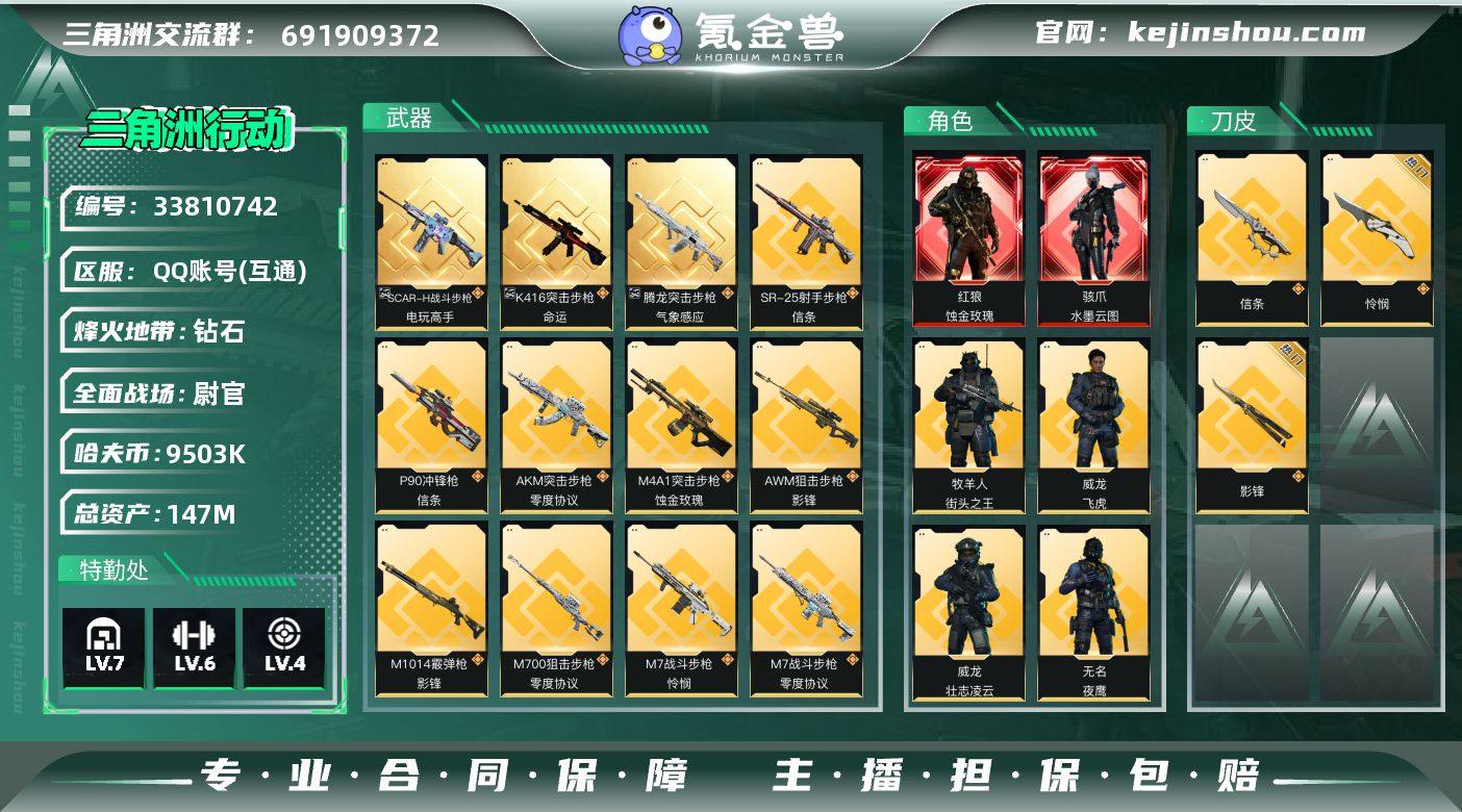 【高氪金土豪号-二红皮+三刀皮+三典藏皮肤+飞虎】【怜悯.影锋.信条.蚀金玫瑰.水墨云图】【SCAR-H战斗步枪-电玩高手极品C.K416突击步枪-命运优品A.腾龙突击步枪-气象感应优品C{雷}】【Q区三端互通】【无二次】YXz5072-特勤处:仓库7级/靶场4级/训练中心6级-总资产147.6m-哈夫币950w-烽火等级:60级 【干员外观】:红狼-蚀金玫瑰,骇爪-水墨云图,威龙-壮志凌云,威龙-飞虎,牧羊人-街头之王,无名-夜鹰 【近战皮肤】:近战-怜悯,近战-影锋,近战-信条,近战-黑鹰 【典藏外观】:SCAR-H战斗步枪-电玩高手,K416突击步枪-命运,腾龙突击步枪-气象感应 【传说外观】:M4A1突击步枪-蚀金玫瑰,AKM突击步枪-零度协议,ASh-12战斗步枪-怜悯,M16A4突击步枪-狩猎时刻,M7战斗步枪-零度协议,M7战斗步枪-怜悯,M7战斗步枪-维京,SG552突击步枪-运动员,AK-12突击步枪-夜鹰,SCAR-H战斗步枪-铁艺苍穹,SCAR-H战斗步枪-水墨云图,G3战斗步枪-狩猎时刻,AS Val突击步枪-蛇年祥瑞,P90冲锋枪-信条,Vector冲锋枪-狩猎时刻,SMG-45冲锋枪-骑士,勇士冲锋枪-能天使-午夜邮差,M1014霰弹枪-影锋,725双管霰弹枪-送葬人-无题密令,SR-25射手步枪-水墨云图,SR-25射手步枪-信条,M700狙击步枪-...