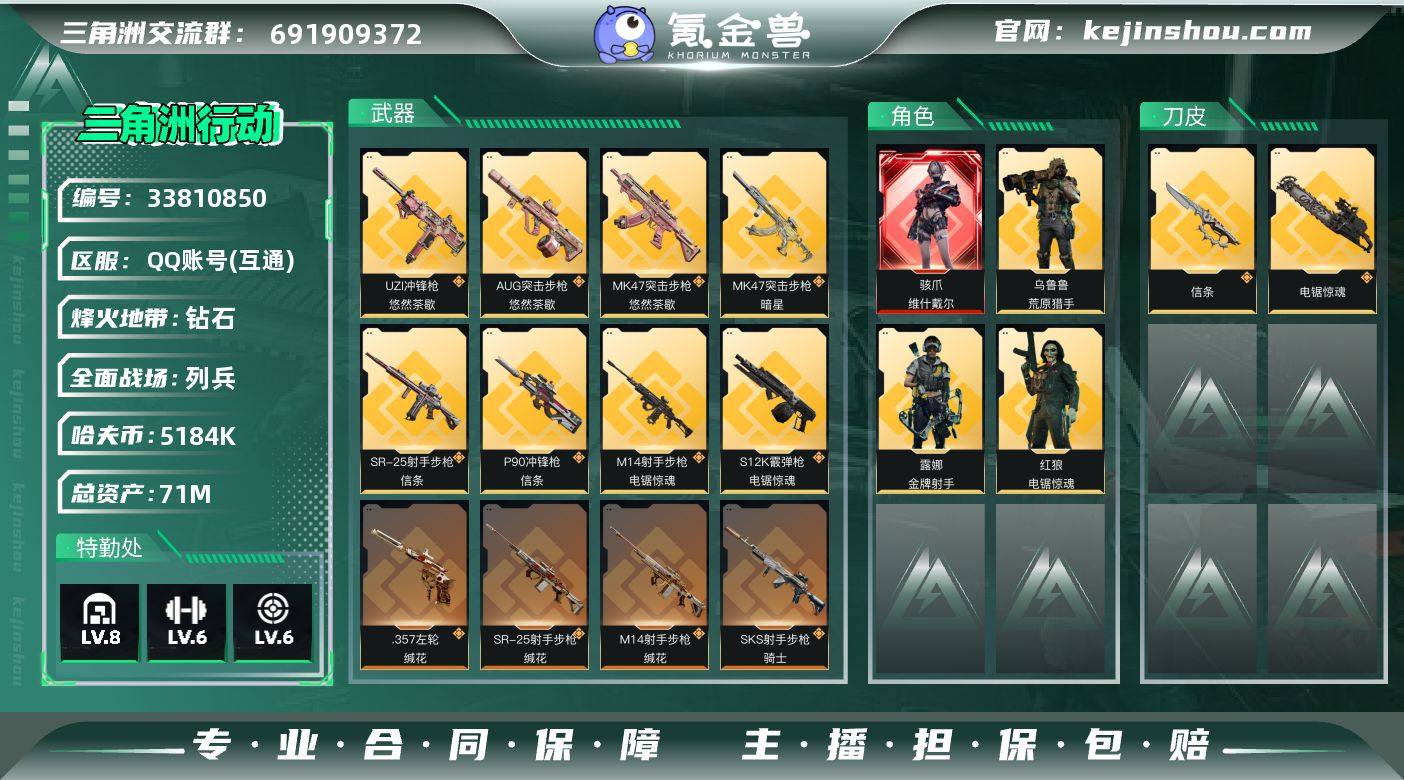 编号A01540 不可二次等级60 总资产71.4m 流动资产25.2m 哈夫币5184k 1红皮 2刀皮 基础安全箱 仓库lv8 训练中心lv6 靶场lv6 维什戴尔 近战武器-信条 近战武器-电锯惊魂