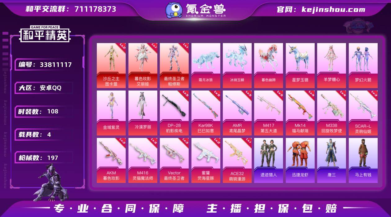 安卓手Q-3神装-5粉装-12特效枪-4载具-10粉色飞行器-65188热力值-9王牌印记-108套装-197枪皮 【红色神装等级】:暮色玫影-艾丽娅(一级),最终圣卫者-帕修斯(一级),沙丘之主-图卡盟(二级) 【红色角色神装】:暮色玫影-艾丽娅,最终圣卫者-帕修斯,沙丘之主-图卡盟 【热门品类】:粉装-梦幻火箭,套装-小丑鱼,套装-龟仙人,套装-红熊茄茄 【粉色套装】:粉装-梦幻火箭,角色-金域紫灵,角色-冷漠罗丽,角色-羊梦糖心 【粉色枪皮等级】:AKM-暮色玫影(三级),SCAR-L-灵驹仙姬(三级),M416-灵猫魔法师(三级),蜜獾-荧海星豚(二级),ACE32-萌骑漫游(一级),Vector-最终圣卫者(三级),Kar98K-巳巳如意(五级),Mk14-福马献瑞(四级),AMR-鸢尾晶梦(五级),M417-第五大道(五级),DP-28-豹影疾电(五级),M338-回旋牧梦使(四级) 【粉色载具】:星梦玉骢,冰绡玉鳞,暮色幽蹄,霜月冰狼 【粉色枪皮】:AKM-暮色玫影,SCAR-L-灵驹仙姬,M416-灵猫魔法师,蜜獾-荧海星豚,ACE32-萌骑漫游,Vector-最终圣卫者,Kar98K-巳巳如意,Mk14-福马献瑞,AMR-鸢尾晶梦,M417-第五大道,DP-28-豹影疾电,M338-回旋牧梦使 【粉色飞行器】:绝对恒星飞行器,炫彩糖果飞行器,沙丘之主天马,终晖之翼飞行...