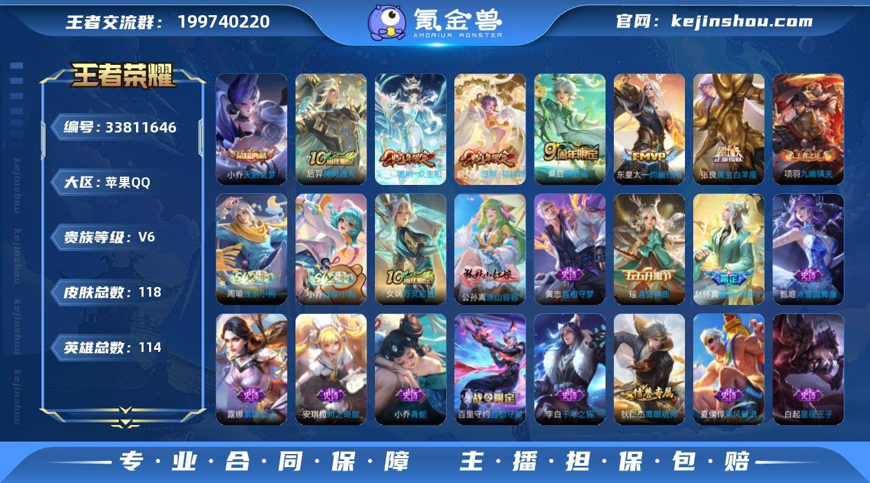 【XY1515】贵族等级6/荣耀典藏数量1/传说皮肤数量7/史诗皮肤数量33/皮肤数量118/英雄数量114/段位至尊星耀/天鹅之梦/朵莉亚神骥鸣幻洲/神树通天/愿照·众生和/愿照·福禄聚/鸣野蒿/灼幽烈阳/黄金白羊座/阴阳师/皇家上将/落雪兰心/魔术师/海滩派对/千军破阵(s25)/顽趣-梦奇/擒涛扼浪(s31)/探海日志(s32)/海盐诗旅(s30)/妲己灵卜魔法/鬼谷子天穹祈灯(S34)/熔金海岸/噬灭天穹(s37)/谧流熔炉/虚灵犬护/逆浪荇歌/荣光之誓/九幽镇关/百相守梦-百里守约/百相守梦-老夫子/茶境仙/访茗客/线条小狗-周瑜/线条小狗-小乔/海月海之女神/万灵启世/涂山容容/百相守梦-黄忠/器灵·浮梦炉/万物之道/时之奇旅-安琪拉/遇见神鹿/青蛇/鹰眼统帅/节奏热浪/星夜王子/舞动绿茵/心灵战警/缤纷独角兽/乘风破浪/乱世虎臣/千年之狐/绅士熊喵/金属风暴/魅力维加斯/水果甜心/偶像歌手/冰雪圆舞曲/圣诞恋歌/未来纪元-赵云/紫霞仙子/影百相守梦/线条小狗-桑启/糖果风暴/溯影追猎/鹤鸣心笺/罗小黑战记/克喵/踏浪烽翎/锦麟游梦/云械蓝图/死霸装/小满鸭/命运加冕/玫蓝誓约/景韶洛都/灵卦秘语/星梦巡礼/雪境奇遇-西施/雾都夜雨/暗都幽影/功夫炙烤/朵莉亚金色潮汐/妄想特派/劲辣红锅/幻泉雾影-海月/乓乓大师/秘密基地/...