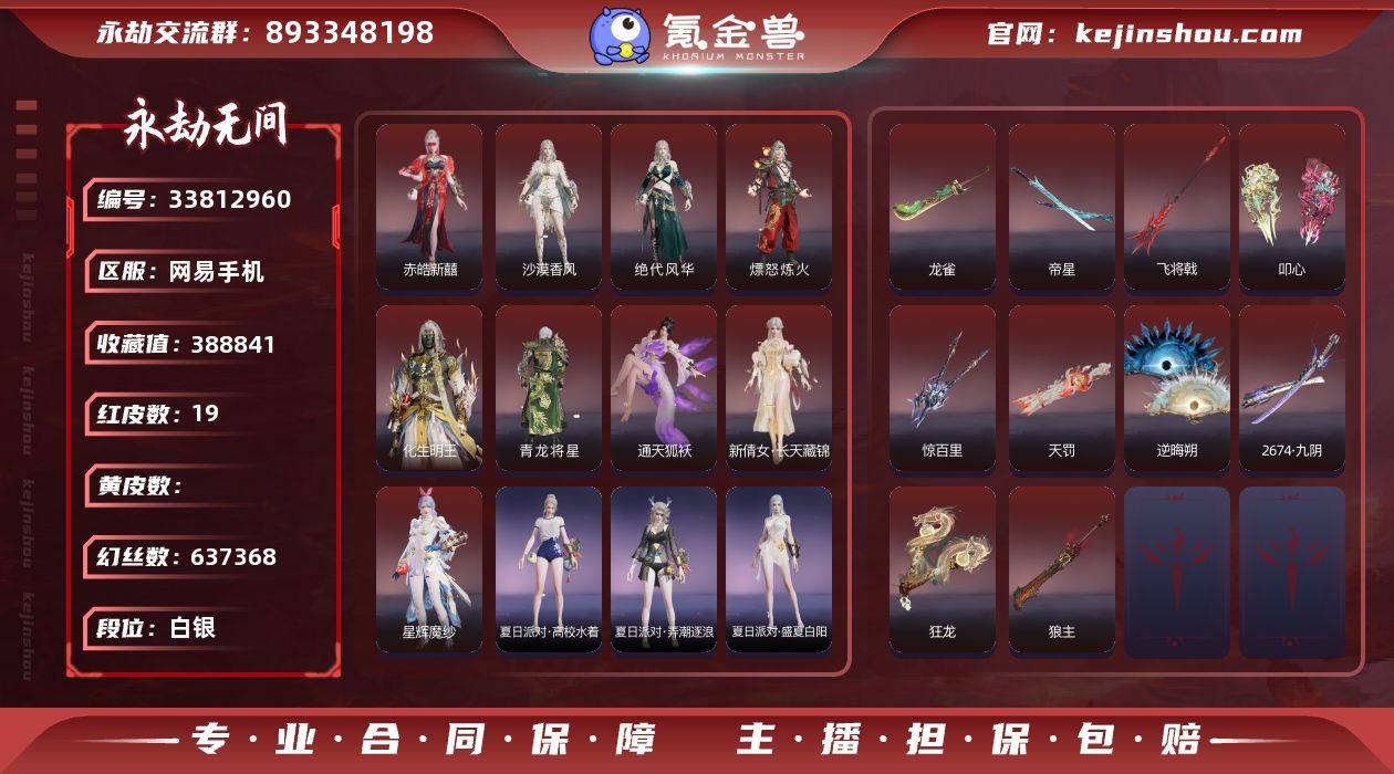 WJ6271,网易手机,网易支付无法注销,5月23可换绑,三人段位白银2,声望50,19红,657金,等级479,收藏值388841,幻丝637368,金砖77,通行证Lv19,变身器,荆魂,西行劫神君印,千秋匠心凶虎,噬骨,霜翎,绿野守护竹韵悠,2674初代机,炎烈珠,红色神品,绝代风华,沙漠香风,星辉魔纱,通天狐袄,化生明王,新倩女幽魂长天藏锦,赤皓新囍,熛怒炼火,青龙将星,天罚,帝星,龙雀,狼主,飞将戟,叩心,逆晦朔,狂龙,惊百里,2674九阴,角色金色皮肤,封神录申公豹,墨染千秋剪春漪,倾国倾城落雁,禄运玉霄,封神录龙吉公主,自动人形A2,赤丹朱湛,祸津素盏,花之倾奇,赤翎之约,共赴无间赤焰舞影,倒反阴阳凛冬,千秋匠心玉叶景,观山海青鸟,夜吻,神鹰之女,火罗圣女,浣烟纱,福瑞天泽,葫芦兄弟蛤蟆头领,街头狂欢不败擂主,观山海秋神蓐收,西行劫悟空,冬无归,夏日派对盛夏白阳,夏日派对高校水着,决战平安京热海白珊,夏日派对弄潮逐浪,龙之道无拘,龙之影过江龙,