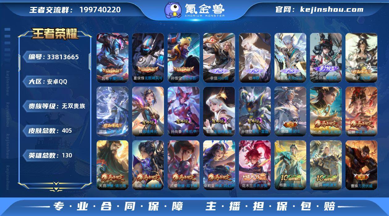 【精品推荐·无双V10·7.6W流光积分·神骥仙使主页·4典藏·4无双·2珍品·破晓神光·马年全限定·牛年全限定·补天·深海之息·武圣·白虎志·万灵伏威·惊梅引·无二次包过】YXw24455-安卓Q-130英雄-405皮肤-11王者印记-300铭文-贵族积分32w【无双贵族10】【4典藏·4无双·2珍品·5星传说·56传说·40按键·80个性戳戳】【因赛季更新游戏段付以上号为准!】 【英雄全皮】:孙权全皮,钟馗全皮,敖隐全皮,夏洛特全皮,空空儿全皮,影全皮,海诺全皮 【荣耀典藏】:武则天英雄,孙悟空全息碎影,夏侯惇无限飓风号,吕布千魇归渊 【无双皮肤】:李信问心剑,铠神罪,诸葛亮天机白泽,公孙离离恨烟 【珍品传说】:伽罗沧流箭,嫦娥器灵落星盏 【星元皮肤】:貂蝉金色仲夏夜,孙尚香未来机甲,孙悟空零号雷霆,刘备时之思念,镜破晓神光 【传说皮肤】:韩信踏浪归,云缨神骥越千峰,关羽神骥镇沧海,朵莉亚神骥鸣幻洲,狄仁杰神骥赴朔漠,貂蝉神骥聚万邦,马超神骥逐星野,花木兰异界灵契,杨戬纵目迁山,后羿神树通天,曹操万灵伏威,后羿千劫归真,海月金乌负日,亚连落雪白狼,典韦战鼓燎原,孙尚香乘龙问璇玑,赵云乘龙铭钟鼎,澜逐花归海,艾琳觅芳踪,露娜霜月吟,宫本武藏惊梅引,东皇太一灼幽烈...