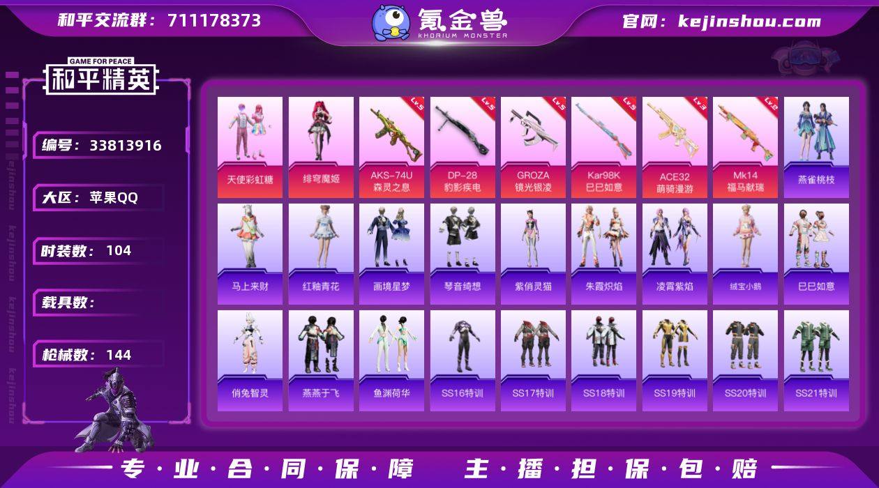 苹果 手Q-2粉装-6特效枪-0载具-0粉色飞行器-46164热力值-12王牌印记-104套装-144枪皮 【粉色套装】:粉装-天使彩虹糖,角色-绯穹魔姬 【粉色枪皮等级】:GROZA-镜光银凌(五级),ACE32-萌骑漫游(三级),AKS-74U-森灵之息(五级),Kar98K-巳巳如意(五级),Mk14-福马献瑞(二级),DP-28-豹影疾电(五级) 【粉色枪皮】:GROZA-镜光银凌,ACE32-萌骑漫游,AKS-74U-森灵之息,Kar98K-巳巳如意,Mk14-福马献瑞,DP-28-豹影疾电 【粉色降落伞】:梦幻火箭降落伞,星之彼岸降落伞,葫芦兄弟降落伞,暗夜玫瑰降落伞,林间仙鹿降落伞,齐天大圣降落伞,风花雪月降落伞,垂柳戏鸭降落伞,千金淑猫降落伞,月影灵韵降落伞,炫彩糖果降落伞 【稀有套装】:套装-绒宝小鹅,套装-巳巳如意,套装-马上来财,角色-俏兔智灵,套装-燕燕于飞,套装-鱼渊荷华,套装-朱霞炽焰,套装-凌霄紫焰,角色-紫俏灵猫,套装-画境星梦,套装-琴音绮想,套装-雨过天青,套装-红釉青花,套装-燕雀桃枝 【稀有枪皮】:AKM-2P战斗服款,AKM-灼热熔岩,AKM-生命誓言,AKM-虎虎生威,AKM-龙的传人,M16A4-甜心亚梦,SCAR-L-玉兔迎春,SCAR-L-龙宫之主,M416-糯团青竹,M416-红色方程式,GROZA-黑色刀锋,AUG-耀粉歌者,A...