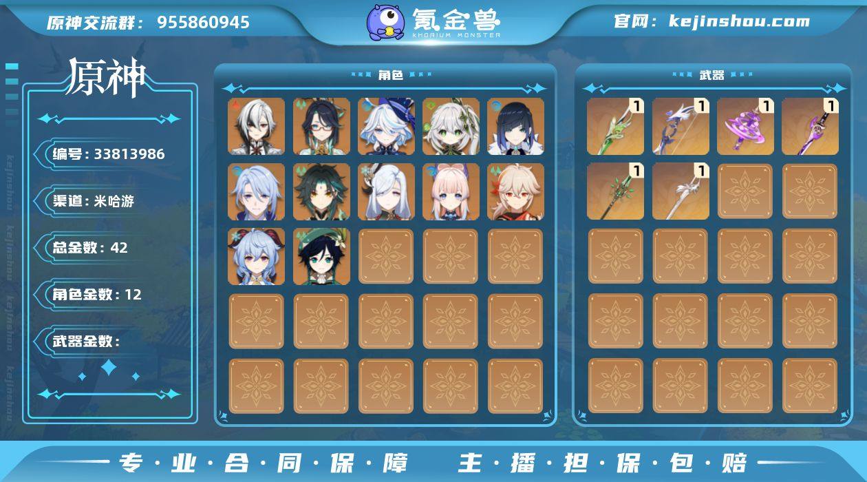 42黄 风元素:0命枫原万叶, 0命闲云, 0命魈, 0命温迪, 0命流浪者 火元素:0命阿蕾奇诺, 1命胡桃 水元素:0命夜兰, 0命珊瑚宫心海, 0命芙宁娜, 0命神里绫人, 0命玛拉妮 冰元素:0命申鹤, 0命甘雨, 0命神里绫华 岩元素:0命荒泷一斗 草元素:0命纳西妲 【常驻五星角色及命座】 风元素:0命梦见月瑞希, 0命琴 火元素:2命迪卢克 水元素:1命莫娜 雷元素:3命刻晴 冰元素:1命七七 草元素:1命提纳里 单手剑:精1裁叶萃光, 精1雾切之回光, 精1风鹰剑 双手剑:精1狼的末路 长柄武器:精1和璞鸢, 精1薙草之稻光 法器:精1神乐之真意, 精1金流监督 弓:精1若水 【角色皮肤】 五星角色:甘雨-玄玉瑶芳, 神里绫华-花时来信 四星角色:菲谢尔-极夜真梦, 凯亚-帆影游风, 丽莎-叶隐芳名