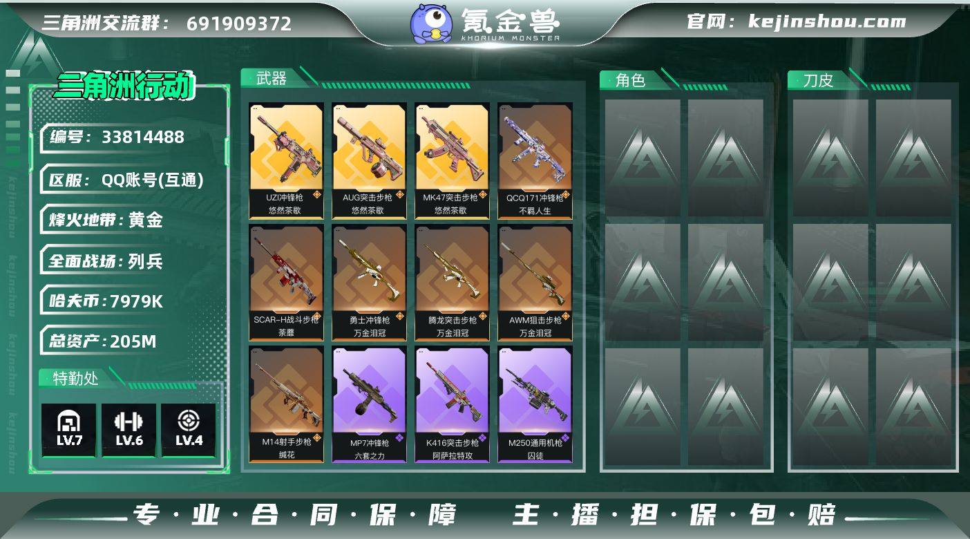 【SJZG5032】总资产205M/哈夫币797万/传说近战数1/传说枪皮数9/战场等级18/行动等级60/安全箱等时效性道具以游戏内数据为准,详情请看图/近战-处刑者4级/近战-黑鹰/AUG突击步枪-悠然茶歇/SCAR-H战斗步枪-荼蘼/腾龙突击步枪-万金泪冠/MK47突击步枪-悠然茶歇/UZI冲锋枪-悠然茶歇/勇士冲锋枪-万金泪冠/QCQ171冲锋枪-不羁人生/M14射手步枪-缄花/AWM狙击步枪-万金泪冠/K416突击步枪-阿萨拉特攻/MP7冲锋枪-六套之力/M250通用机枪-囚徒/M4A1突击步枪-前沿科技/AKM突击步枪-前沿科技/ AK-12突击步枪-马年新春/SCAR-H战斗步枪-荣耀列队/MP5冲锋枪-弄臣/SMG-45冲锋枪-行动开启/SMG-45冲锋枪-幻影结构/M1014霰弹枪-幻影结构/Mini-14射手步枪-荣耀列队/SKS射手步枪-弄臣/QSZ92G-一帆风顺/R93狙击步枪-斑马/M4A1突击步枪-粉色涂装/QBZ95-1突击步枪-海浪/QBZ95-1突击步枪-海色/腾龙突击步枪-三角洲力量/K416突击步枪-几何迷彩/K416突击步枪-高雅黑/M16A4突击步枪-三角洲力量/M16A4突击步枪-高雅黑/M16A4突击步枪-出货/M7战斗步枪-红色涂装/SG552突击步枪-海浪/SG552突击步枪-狂欢/G3战斗步枪-高雅黑/PTR-32突击步枪-黄蜂/CAR-15突击步枪-狂欢/AS Val突击步枪-黑巧甜心/MP5冲锋枪-海色/MP5冲...