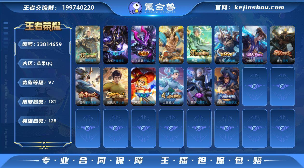 苹果Q 不可二次 金标 曹操 10传说 2星传 寅虎焰心 幽冥之眼 128英雄181皮肤 曦玄引吕布 乘龙淬吴钩 乘龙铭钟鼎 遇见神鼓 神树通天 愿照山河定 鸣野蒿 天魔缭乱 怒海麟威 地狱之眼 至尊宝 御风骁将 岱宗 后羿如梦令 魔法小厨娘 狮舞东方 暗影游猎 黎明之约 死神来了 梁祝 暗夜猫娘 电玩小子 藏狐褐绒 糖绘人间 乘龙聚宝船 燃音魔法 伽罗琥珀纪元 百解令 原初探秘者 李小龙 暗隐猎兽者 猫狗日记男 猫狗日记女 金属风暴 特工战影 青蛇 黄金分割率 优雅恋人 玩趣恶龙 心灵战警 修罗 白龙吟 心灵骇客 幽灵船长 乘风破浪 圣诞狂欢 末日机甲男 星夜王子 绅士熊喵 街头霸王 暗渊魔法 缤纷独角兽 鬼剑武藏 冰雪圆舞曲 青焰无极 苍威无极 御銮 混沌棋 疑决卦 醍醐杖 万华元夜 东方不败 演武夺筹 群星魔术团程咬金 驱傩正仪 未来纪元赵云 沙漠行僧 金庭之子 敏锐之力 海盐诗旅 皇家上将 魅力维加斯 探海日志 水果甜心 古海寻踪 蔬乡物语鲁班 天穹祈灯 地狱燃心 顽岩魄 怒海争锋 夏日便利店蔡文姬 鹰眼统帅 魔术师 王者荣耀账号