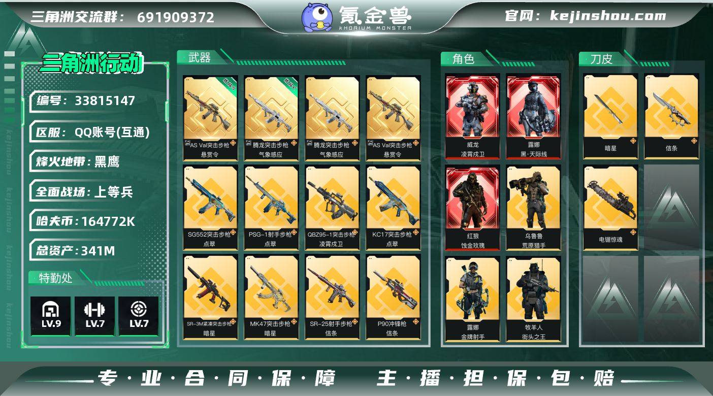 【Q区三端互通】【无二次】YXz9388-特勤处:仓库9级/靶场7级/训练中心7级-总资产341m-哈夫币164m-烽火等级:60级 【干员外观】:红狼-蚀金玫瑰,露娜-黑·天际线,威龙-凌霄戍卫,威龙-铁面判官,威龙-壮志凌云,蜂医-送葬人·无题密令,牧羊人-街头之王,无名-夜鹰,深蓝-不破誓约,红狼-电锯惊魂,露娜-金牌射手,乌鲁鲁-荒原猎手 【近战皮肤】:近战-暗星,近战-信条,近战-电锯惊魂,近战-黑鹰 【典藏外观】:腾龙突击步枪-气象感应*2,AS Val突击步枪-悬赏令 【典藏外观成色】:腾龙突击步枪-气象感应(优品C)*2,AS Val突击步枪-悬赏令(优品S) 【传说外观】:M4A1突击步枪-蚀金玫瑰,M4A1突击步枪-阿米娅,QBZ95-1突击步枪-破军,QBZ95-1突击步枪-凌霄戍卫,ASh-12战斗步枪-鹅鸭杀,M16A4突击步枪-狩猎时刻,M7战斗步枪-神秘艺术,M7战斗步枪-维京,SG552突击步枪-运动员,SG552突击步枪-点翠,AK-12突击步枪-夜鹰,SCAR-H战斗步枪-铁艺苍穹,SCAR-H战斗步枪-启航,G3战斗步枪-狩猎时刻,CAR-15突击步枪-阿米娅,AS Val突击步枪-蛇年祥瑞,腾龙突击步枪-捞点薯条,KC17突击步枪-电锯惊魂,KC17突击步枪-点翠,MK47突击步枪-暗星,P90冲锋枪-信条,Vector冲锋枪-狩猎时刻,S...