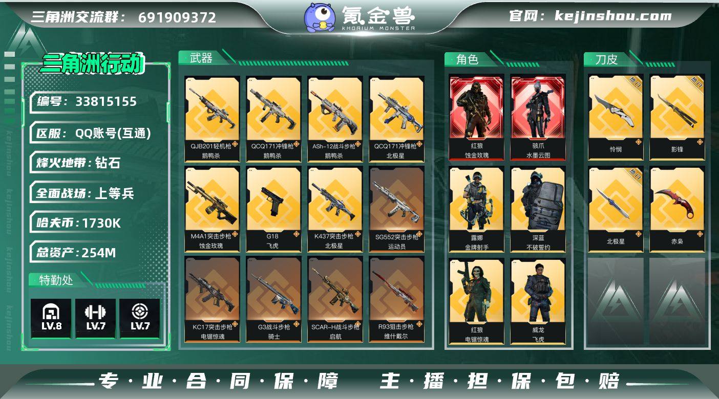 【高氪金土豪号-双红皮+四刀皮+飞虎】【北极星.怜悯.影锋.赤枭.蚀金玫瑰.水墨云图】【Q区三端互通】【【无二次协助处理】】YXz8651-特勤处:仓库8级/靶场7级/训练中心7级-总资产254.4m-哈夫币173w-烽火等级:60级 【干员外观】:红狼-蚀金玫瑰,骇爪-水墨云图,威龙-飞虎,蜂医-送葬人·无题密令,无名-夜鹰,深蓝-不破誓约,红狼-电锯惊魂,露娜-金牌射手 【近战皮肤】:近战-北极星,近战-影锋,近战-怜悯,近战-赤枭,近战-黑鹰 【传说外观】:M4A1突击步枪-蚀金玫瑰,M4A1突击步枪-阿米娅,ASh-12战斗步枪-鹅鸭杀,SG552突击步枪-运动员,AK-12突击步枪-夜鹰,AK-12突击步枪-特斯拉线圈,SCAR-H战斗步枪-水墨云图,SCAR-H战斗步枪-启航,G3战斗步枪-骑士,CAR-15突击步枪-阿米娅,腾龙突击步枪-捞点薯条,K437突击步枪-北极星,KC17突击步枪-电锯惊魂,UZI冲锋枪-特斯拉线圈,SMG-45冲锋枪-骑士,SR-3M紧凑突击步枪-特斯拉线圈,勇士冲锋枪-能天使-午夜邮差,QCQ171冲锋枪-北极星,QCQ171冲锋枪-鹅鸭杀,725双管霰弹枪-送葬人-无题密令,M250通用机枪-骑士之心,QJB201轻机枪-鹅鸭杀,R93狙击步枪-维什戴尔,AWM狙击步枪-捞点薯条,G18-飞虎,93R-捞点薯条,复合弓-黑·天际...