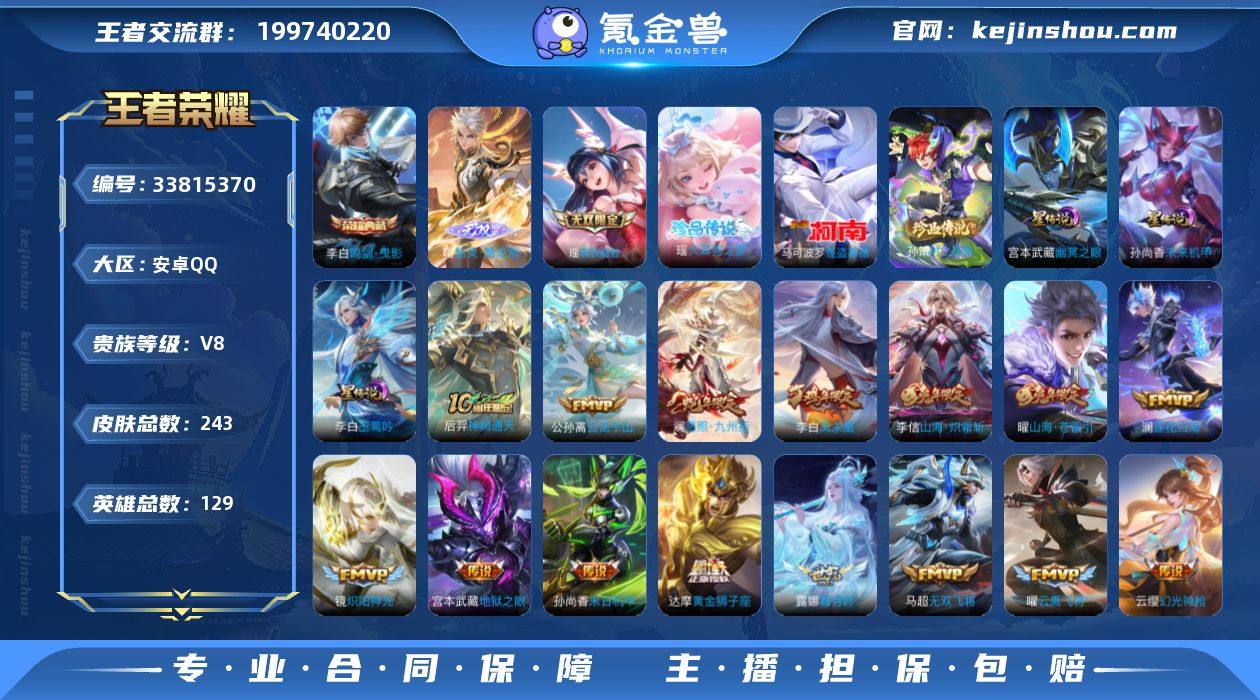 【高性价比·金标1.1w镜·金标曜·打野43段·鸣剑曳影·器灵螭龙剑·真我赫兹·基德·大耳狗之梦·孙策时之奇旅·玉鸾吟·愿照九州拓·记忆之芯·逐花归海·山海苍雷引·山海炽霜斩·无二次包过】YXw24736-安卓Q-129英雄-243皮肤-13王者印记-266铭文-贵族积分5w【贵族8】【1典藏·2无双·3珍品·3星传说·24传说·9按键】【因赛季更新游戏段付以上号为准!】 【英雄全皮】:孙权全皮,敖隐全皮,空空儿全皮,影全皮 【荣耀典藏】:李白鸣剑曳影 【无双皮肤】:曜器灵螭龙剑,瑶真我赫兹 【珍品传说】:瑶大耳狗之梦,孙策时之奇旅,马可波罗怪盗基德 【星元皮肤】:李白玉鸾吟,孙尚香未来机甲,宫本武藏幽冥之眼 【传说皮肤】:后羿神树通天,公孙离云诺千山,澜愿照九州拓,云缨幻光神枪,桑启鸣野蒿,澜逐花归海,露娜霜月吟,诸葛亮鹤羽星尊,公孙离记忆之芯,孙悟空齐天大圣,曜山海苍雷引,李信山海炽霜斩,李白诗剑行,马超无双飞将,周瑜音你心动,镜炽阳神光,虞姬启明星使,曜云鹰飞将,干将莫邪久胜战神,虞姬云霓雀翎,达摩黄金狮子座,李白凤求凰,孙尚香末日机甲,宫本武藏地狱之眼 【限定皮肤】:姜子牙天穹之誓,狄仁杰阴阳师,赵云皇家上将,庄周高山流水,高渐离玩趣恶龙,马可波...