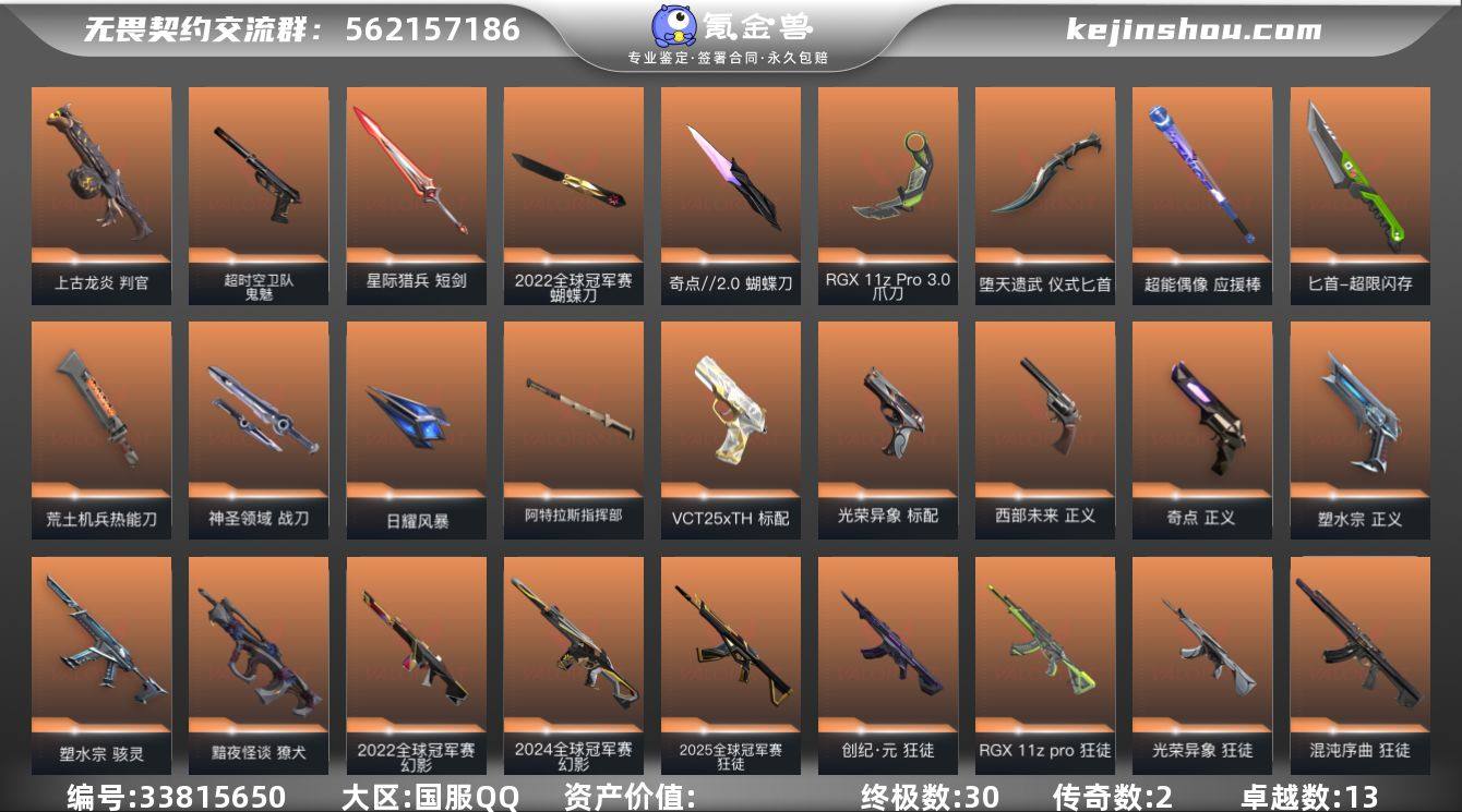 【套装】:2022全球冠军赛套装,回火礼包// V25套装 【英雄】:幻棱,炼狱,维斯,暮蝶,钛狐,壹决,铁臂,捷风,雷兹,幽影,不死鸟,贤者,猎枭,蝰蛇,零,芮娜,奇乐,尚勃勒,霓虹,斯凯,夜露,星礈,K/O,海神,盖可,黑梦,钢锁 【近战武器】:近战武器-2022全球冠军赛 蝴蝶刀,近战武器-蒙太奇 战斧,近战武器-剥皮小刀,近战武器-奇点//2.0 蝴蝶刀,近战武器-RGX 11z Pro//3.0 爪刀,近战武器-超能偶像 应援棒,近战武器-超限闪存 匕首,近战武器-堕天遗武 仪式匕首,近战武器-荒土机兵 热能刀,近战武器-神圣领域 战刀,近战武器-日耀风暴 遗器,近战武器-阿特拉斯指挥部 甩棍,近战武器-星际猎兵 短剑 【狂徒】:狂徒-2025全球冠军赛,狂徒-混沌序曲,狂徒-塑水宗,狂徒-创·纪元,狂徒-RGX 11z Pro,狂徒-光荣异象,狂徒-堕天遗武,狂徒-掠影,狂徒-盖亚的复仇,狂徒-海洋之星,狂徒-日冕雄师,狂徒-紫阙金琅,狂徒-超能偶像,狂徒-荒土机兵,狂徒-诡秘蛇影 【幻影】:幻影-2022全球冠军赛,幻影-2024全球冠军赛,幻影-侦察力量,幻影-异鳞魔蛇,幻影-超限闪存,幻影-神圣领域,幻影-蒙太奇,幻影-聚合之力,幻影-纳米打击,幻影-末日之翼 【戍卫】:戍卫-盖亚的...