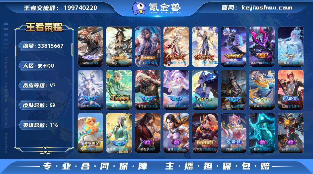 【精品小号·问心剑·沧流箭·兔狲蓬尾·愿照山河定·澜愿照九州拓·澜逐花归海·露娜霜月吟·齐天大圣·星穹之声·孙尚香异界灵契·可二次】YXw25598-安卓Q-116英雄-99皮肤-1王者印记-70铭文-贵族积分2w【贵族7】【1无双·2珍品·9传说·11按键】【因赛季更新游戏段付以上号为准!】 【英雄全皮】:敖隐全皮 【无双皮肤】:李信问心剑 【珍品传说】:伽罗沧流箭,张飞兔狲蓬尾 【传说皮肤】:司空震愿照山河定,澜愿照九州拓,桑启鸣野蒿,澜逐花归海,露娜霜月吟,孙悟空齐天大圣,王昭君星穹之声,孙尚香异界灵契,宫本武藏地狱之眼 【限定皮肤】:大乔绒语心约,姜子牙天穹之誓,狄仁杰阴阳师,赵云皇家上将,孙尚香异界灵契,狄仁杰魔术师,项羽海滩派对,王昭君星穹之声,孙悟空齐天大圣,嫦娥拒霜思,艾琳女武神,张良古海寻踪,周瑜熔金海岸 【年限皮肤】:司空震愿照山河定,澜愿照九州拓 【赛季限定】:张良古海寻踪,姜子牙天穹之誓,东皇太一噬灭天穹,太乙真人谧流熔炉,钟馗虚灵犬护 【战令限定】:孙膑茶境仙,马超访茗客,刘禅鸭鸭历险记,沈梦溪鸭鸭历险记,周瑜线条小狗 【史诗皮肤】:海月海之女神,明世隐百晓客,周瑜线条小狗,狂铁龙之律动,刘禅鸭鸭历险记,赵怀真器...