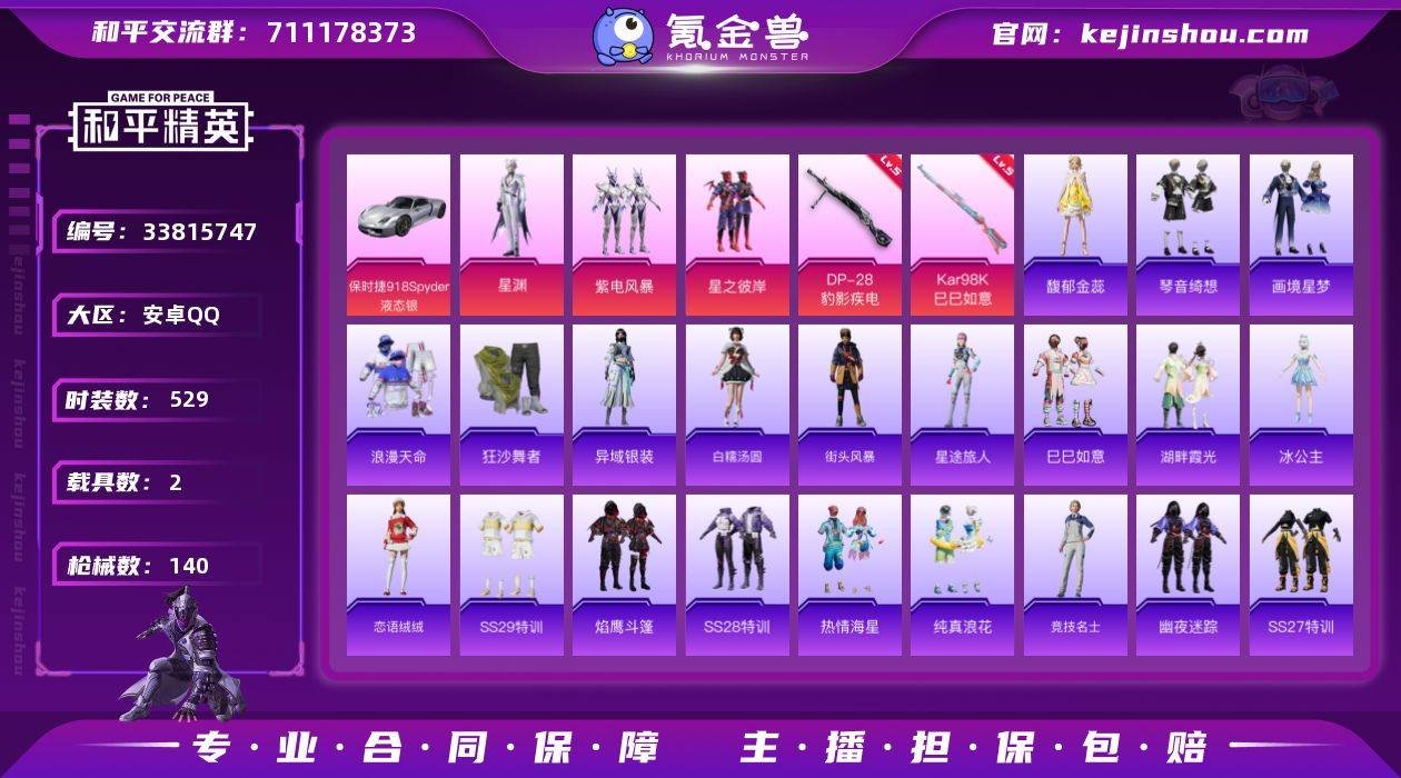 【特价出售】钱包无法注销安卓Q-1稀有2载具3粉装2特效枪7热门136套装139枪皮 45653热力值 12印记 历史传奇王牌15星 【1稀有】 浪漫天命 【2载具】 仰望U7先锋版(阿盖尔紫) 保时捷918Spyder(液态银) 【3粉装】 星渊 星之彼岸 紫电风暴 【2特效枪】 Kar98K-巳巳如意 (5级) DP-28-豹影疾电 (5级) 【7热门】 激萌罗小黑 团圆交子 瑞龙福将 狂沙舞者 破蛋小黄鸡 极速红龙 M762-瑞龙福将 【1飞行器】 天之羽翼飞行器