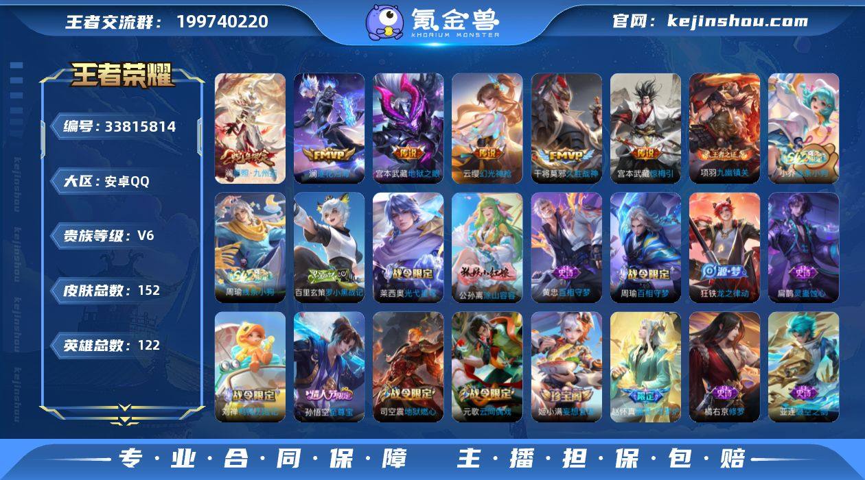 无二次-安卓Q-V6-至尊星耀V段位-122英雄-152皮肤-6传说-44史诗 【英雄全皮】:孙权全皮,敖隐全皮,空空儿全皮 【传说皮肤】:澜愿照九州拓,云缨幻光神枪,澜逐花归海,宫本武藏惊梅引,干将莫邪久胜战神,宫本武藏地狱之眼 【限定皮肤】:姜子牙天穹之誓,李白谪仙醉月,狄仁杰阴阳师,赵云皇家上将,元歌云间偶戏,狄仁杰魔术师,项羽海滩派对,孙悟空至尊宝,裴擒虎李小龙,嫦娥拒霜思,司空震地狱燃心,蒙犽百解令,鬼谷子天穹祈灯,姬小满妄想食味,沈梦溪龙舞盛年,鲁班七号蔬乡物语,刘邦剑破天穹,项羽苍威无极 【年限皮肤】:澜愿照九州拓 【赛季限定】:鬼谷子天穹祈灯,刘邦剑破天穹,姜子牙天穹之誓,东皇太一噬灭天穹,太乙真人谧流熔炉,钟馗虚灵犬护,甄姬逆浪荇歌,亚瑟荣光之誓,项羽九幽镇关 【战令限定】:元歌云间偶戏,司空震地狱燃心,鲁班七号蔬乡物语,项羽苍威无极,亚连破空之剑,孙悟空神迹守卫,刘禅鸭鸭历险记,沈梦溪鸭鸭历险记,周瑜百相守梦,孙策百相守梦,莱西奥光弋星穹,明世隐往忆晖光,周瑜线条小狗,小乔线条小狗 【史诗皮肤】:周瑜线条小狗,小乔线条小狗,项羽九幽镇关,百里玄策罗小黑战记,莱西奥光弋星穹,公孙离涂山容容,黄...