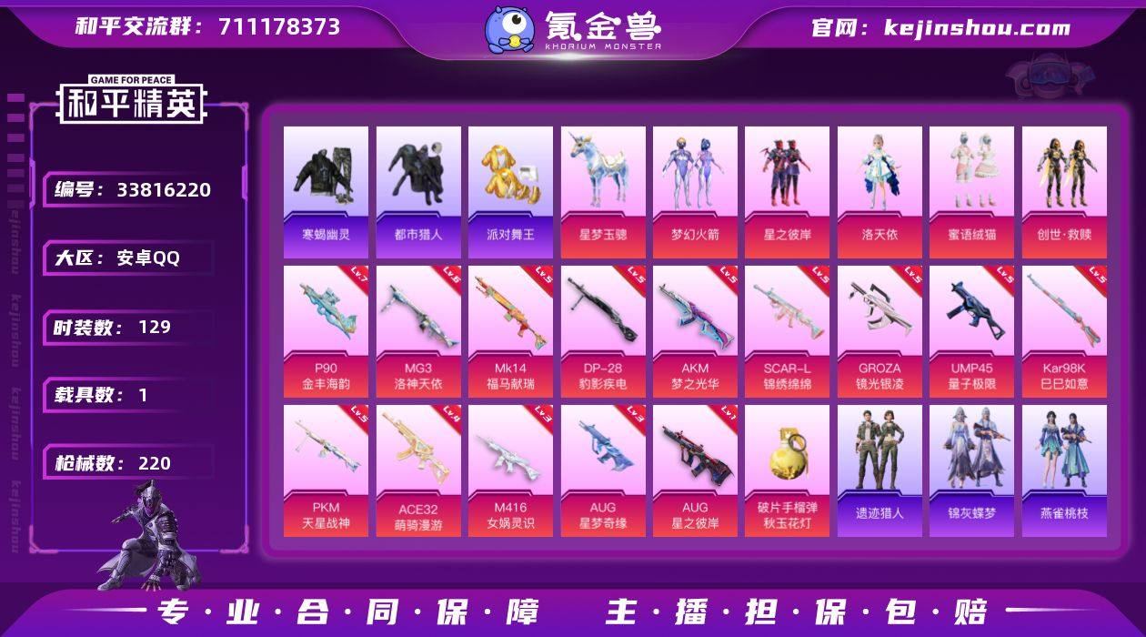 【kyhp2087】安卓 手Q-5粉装-15特效枪-1载具-8粉色飞行器-67764热力值-11王牌印记-129套装-220枪皮 【热门品类】:粉装-梦幻火箭,套装-寒蝎幽灵,套装-浪漫天命,套装-都市猎人,套装-派对舞王,套装-小丑鱼,套装-龟仙人,套装-暗影哥特,角色-Mark.06 【粉色套装】:粉装-梦幻火箭,粉装-星之彼岸,角色-洛天依,粉装-蜜语绒猫,套装-创世·救赎 【粉色枪皮等级】:AKM-梦之光华(五级),SCAR-L-锦绣绵绵(五级),M416-女娲灵识(三级),GROZA-镜光银凌(五级),AUG-星之彼岸(一级),AUG-星梦奇缘(三级),ACE32-萌骑漫游(四级),UMP45-量子极限(五级),P90-金丰海韵(七级),Kar98K-巳巳如意(五级),Mk14-福马献瑞(五级),DP-28-豹影疾电(五级),MG3-洛神天依(六级),PKM-天星战神(五级) 【粉色载具】:星梦玉骢 【粉色枪皮】:AKM-梦之光华,SCAR-L-锦绣绵绵,M416-女娲灵识,GROZA-镜光银凌,AUG-星之彼岸,AUG-星梦奇缘,ACE32-萌骑漫游,UMP45-量子极限,P90-金丰海韵,Kar98K-巳巳如意,Mk14-福马献瑞,DP-28-豹影疾电,MG3-洛神天依,PKM-天星战神,破片手榴弹-秋玉花灯 【粉色飞行器】:炫彩糖果飞行器,星之彼岸飞行器,动力核心飞行器,幻海仙踪飞行器,时光之吻飞行器...