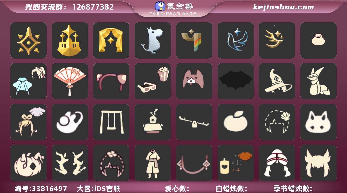账号类型: 手机账号 季节已毕业: 预言季,梦想季,表演季,姆明季,彩染季,青鸟季,迁徙季 完成地图: 雨林,霞谷,暮土 珍稀物品: 阿努比斯(狗头),白枭 礼包: 蝙蝠套,巫师,小狐狸,绊爱,兔子鞋,秋千,茶桌,跷跷板,橘子,贝壳,兔子,南瓜,枯角,四叶草,暗彩装扮,新年耳钉,创始人,献瑞折扇礼包,小狗周年发饰,粽子发饰礼包,青衫落拓礼包,周年影院套餐礼包,小黄鸭发饰礼包 裤子: 武士裤,白棉裤 面具: 黄鼠狼,阿努比斯 项链: 围巾 发型: 蝴蝶结,正太,樱花,公主头,虚荣,猫耳,白枭 头饰: 花环 斗篷: 白金,红金,白鸟斗,花瓣斗篷,荧蓝斗篷 配饰: 雨伞,高音钢琴,吉他,笛子,大铃铛乐器 亮点: 重塑药水44