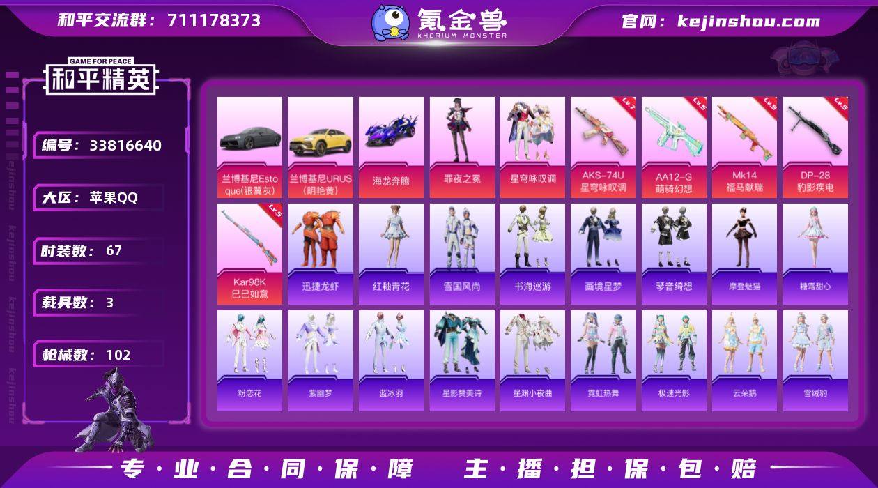 67套装/枪械5/装备131/载具3/战备73/王牌印记8/热力值33967/七级AKS-74U-星穹咏叹调/五级Kar98K-巳巳如意/五级MK14-福马献瑞/五级AA12-G-萌骑幻想/五级DP-28-豹影疾电/星穹咏叹调/罪夜之冕/兰博基尼Estoque(银翼灰)/兰博基尼URUS(明艳黄)/海龙奔腾/AKS-74U-星穹咏叹调/Kar98K-巳巳如意/MK14-福马献瑞/AA12-G-萌骑幻想/DP-28-豹影疾电/春暖花开降落伞/千金淑猫降落伞/临安公主降落伞/星穹咏叹调降落伞/幻彩电音降落伞/炫彩糖果降落伞/雪国风尚/迅捷龙虾/摩登魅猫/糖霜甜心/粉恋花/紫幽梦/蓝冰羽/星影赞美诗/星渊小夜曲/霓虹热舞/极速光影/云朵鹅/雪绒豹/书海巡游/画境星梦/琴音绮想/雨过天青/红釉青花/AKM-彩虹符号/AKM-萌趣颜团子/SCAR-L-玉兔迎春/SCAR-L-红色方程式/M416-红色方程式/GROZA-异彩先驱/GROZA-彩虹符号/AUG-青春冒险家/M762-云朵鹅/Mk47-青春冒险家/G36C-星穹咏叹调/AC-VAL-天降萌叽/ACE32-画境星梦/UZI-啾咪啾咪/UMP45-生命誓言/Vector-夜灯/Vector-生命誓言/汤姆逊-天降萌叽/汤姆逊-异彩先驱/汤姆逊-耀粉歌者/汤姆逊-樱桃泡泡/汤姆逊-像素花束/野牛-青春冒险家/MP5K-异彩先驱/MP5K-画境星梦/Kar98K-红色方程式/Kar98K-星穹咏叹调/M24-幻彩电音/SKS-炫彩节奏/VS...