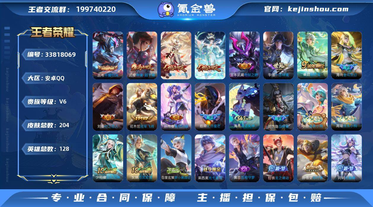 安卓Q-V6-尊贵铂金I段位-128英雄-204皮肤-1典藏皮肤-11传说-57史诗 【英雄全皮】:孙权全皮,敖隐全皮 【荣耀典藏】:吕布千魇归渊 【传说皮肤】:云缨神骥越千峰,妲己愿照众生和,澜愿照九州拓,桑启鸣野蒿,海月金乌负日,孙尚香音你闪耀,后羿无尽星芒,李信一念神魔,刘备时之恋人,花木兰冠军飞将,宫本武藏地狱之眼 【限定皮肤】:蒙犽顽岩魄,蔡文姬夏日便利店,虞姬夏日便利店,姜子牙天穹之誓,狄仁杰阴阳师,赵云皇家上将,嬴政优雅恋人,狄仁杰魔术师,项羽海滩派对,孙悟空孙行者,后羿无尽星芒,米莱狄胡桃异想国,鲁班大师探海日志,高渐离燃音魔法,妲己灵卜魔法,鬼谷子天穹祈灯,鲁班七号蔬乡物语,李元芳蔬乡物语,海月金乌负日,刘邦剑破天穹,程咬金群星魔术团,镜青焰无极,项羽苍威无极,芈月浮光幕影,周瑜熔金海岸 【年限皮肤】:妲己愿照众生和,澜愿照九州拓 【赛季限定】:鲁班大师探海日志,鬼谷子天穹祈灯,刘邦剑破天穹,姜子牙天穹之誓,东皇太一噬灭天穹,太乙真人谧流熔炉,钟馗虚灵犬护,甄姬逆浪荇歌,亚瑟荣光之誓 【战令限定】:米莱狄胡桃异想国,高渐离燃音魔法,妲己灵卜魔法,鲁班七号蔬乡物语,李元芳蔬乡物语,镜青焰无极,项羽...