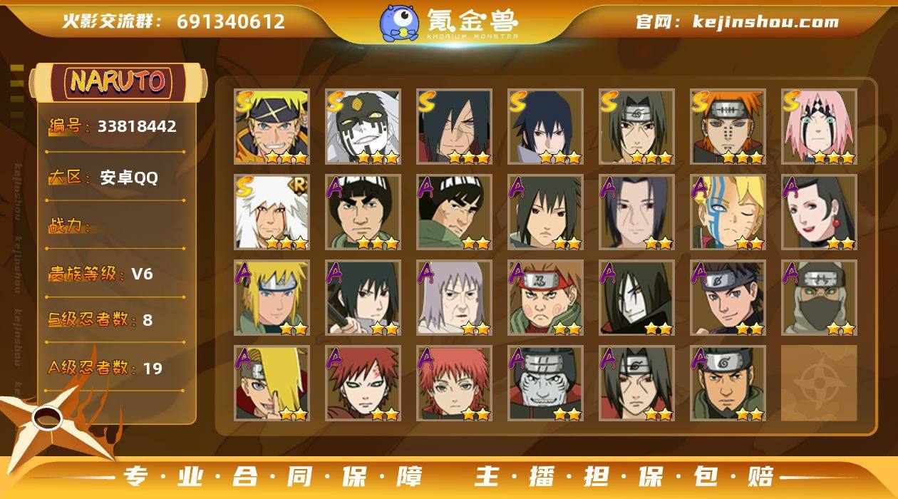 【HYX3792】VIP等级V6/S忍数量8/A忍数量19/二星A-我爱罗「疾风传」/二星A-宇智波鼬/三星S-宇智波佐助「永恒万花筒」/二星A-猿飞日斩「火影继承人」/二星A-蝎/三星S-佩恩「天道」/三星S-漩涡鸣人·宇智波佐助/二星A-角都「地怨虞」/二星A-秋道丁次「忍界大战」/二星A-漩涡博人「桃式显现」/三星S-大筒木桃式/二星A-波风水门 「青年」/三星S-自来也「舞之豪杰」/二星A-猿飞阿斯玛/三星S-春野樱 「忍界大战」/二星A-宇智波鼬 「夏日限定」/二星A-宇智波泉奈/二星A-迪达拉/二星A-干柿鬼鲛/三星A-迈特凯/三星S-宇智波斑「秽土转生·解」/二星A-不缘/二星A-迈特凯「青春爆炸」/二星A-宇智波佐助「须佐能乎」/二星A-千代「近松十人卫」/二星A-大蛇丸「晓」/三星S-宇智波鼬 「须佐能乎」