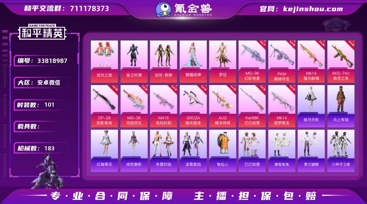 【LHPX1934】【特价出售/店主推荐】安卓 微信-5粉装-11特效枪-3粉色飞行器-52405热力值-10王牌印记-101套装-183枪皮【热门品类】:套装-龟仙人【粉色套装】:粉装-炫光之旅,角色-宙之时溯,套装-创世·救赎,角色-智耀战神,角色-罗征【粉色枪皮等级】:M416-电玩时刻(五级),GROZA-镜光银凌(五级),AUG-暖羊咩咩(五级),AKS-74U-森灵之息(五级),Kar98K-巳巳如意(五级),Mk14-甜梦熊击(五级),Mk14-福马献瑞(五级),DP-28-豹影疾电(五级),PKM-萌骑夺宝(五级),MG-36-幻彩电音(七级),MG-36-沧焰双生(五级)【粉色枪皮】:M416-电玩时刻,GROZA-镜光银凌,AUG-暖羊咩咩,AKS-74U-森灵之息,Kar98K-巳巳如意,Mk14-甜梦熊击,Mk14-福马献瑞,DP-28-豹影疾电,PKM-萌骑夺宝,MG-36-幻彩电音,MG-36-沧焰双生【粉色飞行器】:炫彩糖果飞行器,BEARBRICK飞行器,幻星舰长飞行器