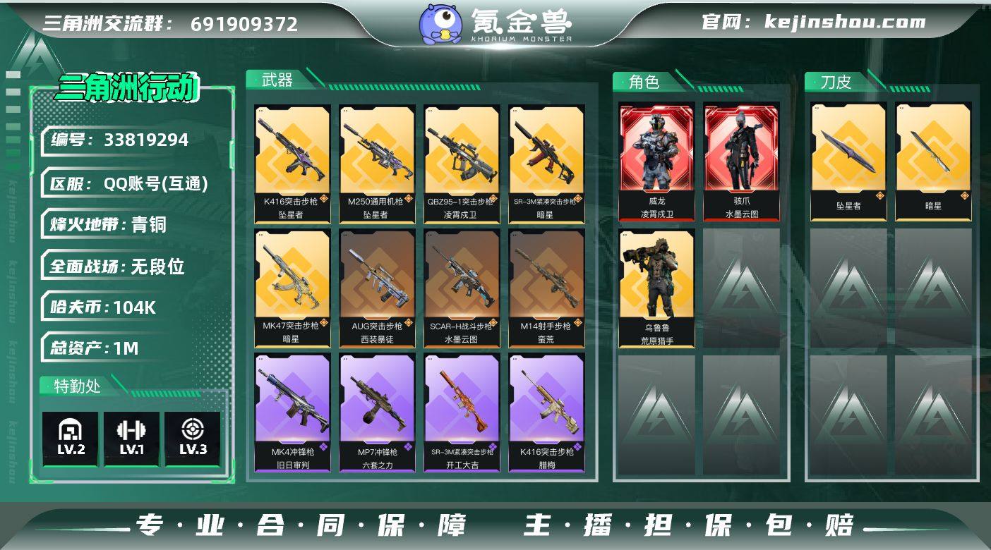 【SJZF8095】总资产1M/哈夫币10万/传说近战数1/传说枪皮数8/战场等级4/行动等级60/安全箱等时效性道具以游戏内数据为准,详情请看图/骇爪-水墨云图/威龙-凌霄戍卫/乌鲁鲁-荒原猎手/近战-坠星者/近战-暗星/近战-处刑者2级/近战-黑鹰/QBZ95-1突击步枪-凌霄戍卫/K416突击步枪-坠星者/AUG突击步枪-西装暴徒/SCAR-H战斗步枪-水墨云图/MK47突击步枪-暗星/SR-3M紧凑突击步枪-暗星/M250通用机枪-坠星者/M14射手步枪-蛮荒/K416突击步枪-腊梅/K437突击步枪-丛林谍踪/SR-3M紧凑突击步枪-开工大吉/勇士冲锋枪-丛林谍踪/MP7冲锋枪-六套之力/MK4冲锋枪-旧日审判/M249轻机枪-丛林谍踪/VSS射手步枪-丛林谍踪/M4A1突击步枪-千里骏骨/AS Val突击步枪-休闲时光/PSG-1射手步枪-休闲时光/SG552突击步枪-马年新春/ AK-12突击步枪-马年新春/CAR-15突击步枪-来财/KC17突击步枪-来财/P90冲锋枪-执法武装/SMG-45冲锋枪-行动开启/SR-3M紧凑突击步枪-马年新春/Mini-14射手步枪-来财/G18-前沿科技/R93狙击步枪-斑马/M249轻机枪-彩墨涂鸦/M1911-生存玩家/K416突击步枪-重击/M16A4突击步枪-出货/M16A4突击步枪-玲珑/M7战斗步枪-重击/SCAR-H战斗步枪-几何狂想/PTR-32突击步枪-典雅/MP5冲锋枪-典雅/MP5冲锋枪-几...