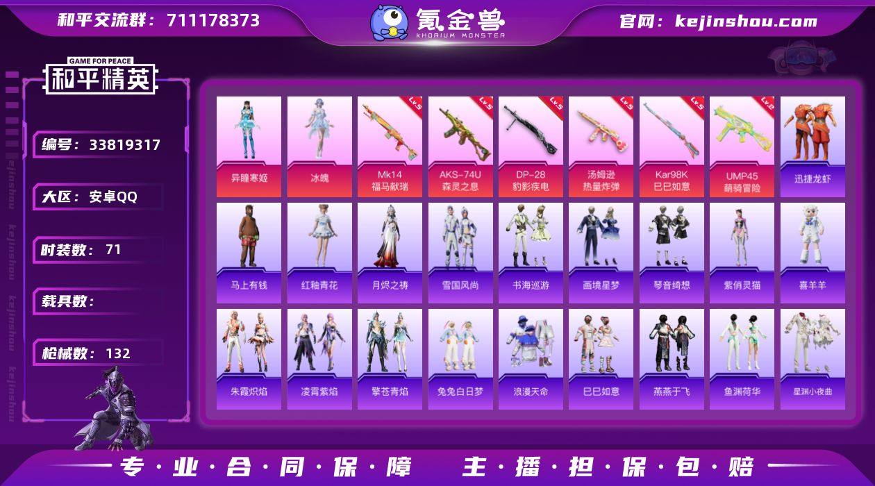 安卓 手Q-2粉装-6特效枪-0载具-1粉色飞行器-32344热力值-6王牌印记-71套装-132枪皮 【热门品类】:套装-浪漫天命 【粉色套装】:角色-冰魄,角色-异瞳寒姬 【粉色枪皮等级】:UMP45-萌骑冒险(二级),汤姆逊-热量炸弹(五级),AKS-74U-森灵之息(五级),Kar98K-巳巳如意(五级),Mk14-福马献瑞(五级),DP-28-豹影疾电(五级) 【粉色枪皮】:UMP45-萌骑冒险,汤姆逊-热量炸弹,AKS-74U-森灵之息,Kar98K-巳巳如意,Mk14-福马献瑞,DP-28-豹影疾电 【粉色飞行器】:炫彩糖果飞行器 【粉色降落伞】:绝对恒星降落伞,四圣焕新降落伞,第五大道降落伞,江南烟雨降落伞,无垠阁降落伞,异瞳寒姬降落伞,炫彩糖果降落伞,罪夜之冕降落伞 【稀有套装】:套装-巳巳如意,套装-雪国风尚,套装-炫彩糖果,套装-马上有钱,套装-迅捷龙虾,套装-燕燕于飞,套装-鱼渊荷华,套装-星渊小夜曲,套装-彩虹兔,套装-云朵鹅,套装-雪绒豹,角色-绛羽幽主,套装-朱霞炽焰,套装-凌霄紫焰,套装-擎苍青焰,玩偶服-喜羊羊,角色-紫俏灵猫,套装-书海巡游,套装-画境星梦,套装-琴音绮想,角色-月烬之祷,套装-雨过天青,套装-红釉青花 【稀有枪皮】:AUG-冰晶雪宝,AKM-破晓战魂,AKM-虎虎生威,AKM-龙的...