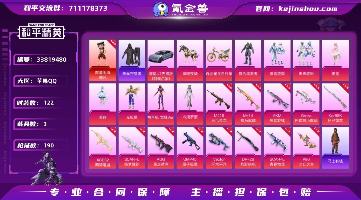 【kyhp1484】苹果 手Q-1神装-8粉装-13特效枪-3载具-3粉色飞行器-62839热力值-7王牌印记-122套装-190枪皮 【红色神装等级】:魔童闹海-哪吒(二级) 【红色角色神装】:魔童闹海-哪吒 【热门品类】:套装-奇异狩猎者,角色-军刀雅典娜,套装-SS1特训,套装-龟仙人,角色-8号机,角色-Mark.06 【粉色套装】:角色-复仇流浪者,粉装-傲雪凌霜,粉装-未来歌姬,角色-美雪,角色-美琪,角色-光极星,角色-初号机 觉醒Ver.,角色-冷漠罗丽 【粉色枪皮等级】:AKM-炫紫旋律(五级),SCAR-L-青春物语(三级),SCAR-L-纯梦嫁纱(四级),M416-五爪金龙(六级),GROZA-巴啦啦小魔仙(五级),AUG-星之彼岸(四级),ACE32-萌骑漫游(四级),UMP45-量子极限(四级),Vector-环太平洋(四级),P90-沙丘之主(二级),Kar98K-巳巳如意(五级),Mk14-福马献瑞(五级),DP-28-豹影疾电(三级) 【粉色载具】:仰望U7(阿盖尔紫),黑曜夜骑,辉羽雀灵自行车 【粉色枪皮】:AKM-炫紫旋律,SCAR-L-青春物语,SCAR-L-纯梦嫁纱,M416-五爪金龙,GROZA-巴啦啦小魔仙,AUG-星之彼岸,ACE32-萌骑漫游,UMP45-量子极限,Vector-环太平洋,P90-沙丘之主,Kar98K-巳巳如意,Mk14-福马献瑞,DP-28-豹影疾电 【粉色飞行器】:...