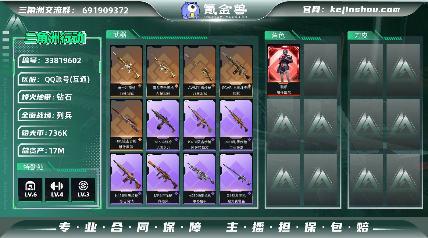 【sjz7444】总资产:17.7M, 哈夫币:736160 ;总资产17M/哈夫币73万/战场等级17/行动等级60/安全箱等时效性道具以游戏内数据为准,详情请看图 骇爪-维什戴尔,近战-黑鹰,SCAR-H战斗步枪-启航,腾龙突击步枪-万金泪冠,勇士冲锋枪-万金泪冠,R93狙击步枪-维什戴尔,AWM狙击步枪-万金泪冠,K416突击步枪-冬日风情,K416突击步枪-阿萨拉特攻,G3战斗步枪-哈夫克警备,MP5冲锋枪-竞技风,Vector冲锋枪-阿萨拉文明,SR-3M紧凑突击步枪-战术竞备,MP7冲锋枪-六套之力,M250通用机枪-寒冬猎手,QJB201轻机枪-炽焰,M14射手步枪-工业狂潮,M700狙击步枪-哈夫克警备,AKM突击步枪-肃杀,K416突击步枪-一帆风顺,SG552突击步枪-贴花艺术, AK-12突击步枪-马年新春,SCAR-H战斗步枪-荣耀列队,K437突击步枪-生存指令,MP5冲锋枪-弄臣,MP5冲锋枪-哈夫克卫队,UZI冲锋枪-前沿科技,野牛冲锋枪-前沿科技,勇士冲锋枪-冰天雪地,QCQ171冲锋枪-银鹭,M1014霰弹枪-幻影结构,M249轻机枪-冰天雪地,SR-25射手步枪-开拓,SR-25射手步枪-行动开启,QSZ92G-一帆风顺,G18-哈夫克航天,AKM突击步枪-噬菌体,M4A1突击步枪-粉色涂装,M4A1突击步枪-高雅黑,M4A1突击步枪-海色,QBZ95-1突击步枪-高雅黑,QBZ95-1突击步枪-海浪,QBZ95-1突击步枪-海...