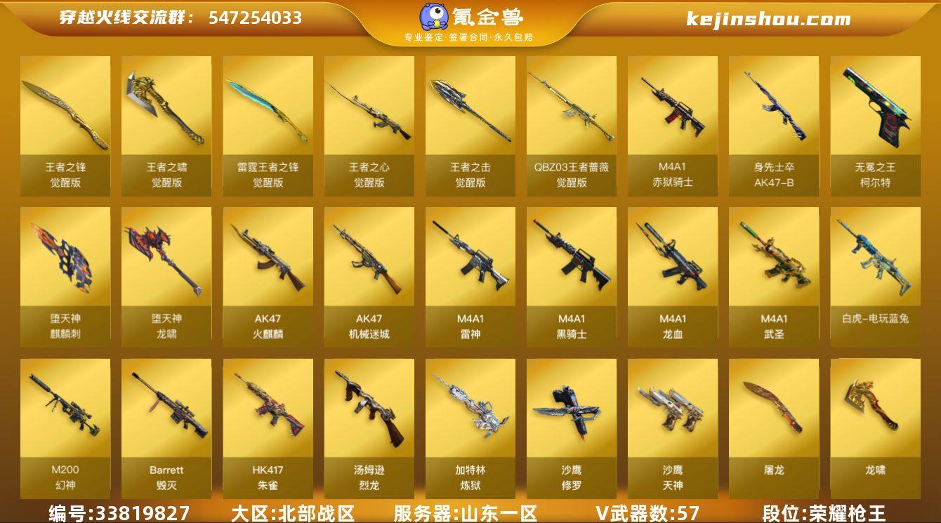 山东一区-70V-10王者武器数-0炫金武器数 【热门武器】:HK417-朱雀,M200-幻神,M200-竞技荣光,死亡之眼,白虎-电玩蓝兔,柯尔特-冠军之特,M4A1-黑骑士*2,汤姆逊-烈龙*6,加特林-炼狱*2,斯泰尔-蝴蝶,USP-雷暴,沙鹰-修罗,Knife-冠军之刃 【王者炫金武器】:高爆手雷-雷霆王者 【音效卡】:M200-幻神音效卡,AK47-火麒麟音效卡,M4A1-雷神音效卡,M4A1-黑骑士音效卡,QBZ03-金色蔷薇音效卡 【皮肤】:幻神-巅峰荣耀,白虎-电玩粉兔皮肤,雷神-荣耀之魄,雷神-冠军之魄,毁灭-冠军之怒,毁灭-黑大圣皮肤,黑骑士耀金皮肤,战神-粉色甜心皮肤,AK47-B-常胜将军-曹操*2,AK47-B-常胜将军-刘备,AK47-B-常胜将军-孙权 【角色】:樱,瞳,电竞教官-云悠悠,零·纪元,王者-葵-貂蝉,乔伊教练,修道士,暗夜-X,嘉年华灵狐,灵动武士,灵狐者-X,灵狐者-职业经理,潘多拉-X,潘多拉-甜心教官,青霞仙子,铁骑荣耀,兔囡囡,王者-零-传说之路,樱-战斗天使,职业选手 【人偶武器】:M4A1-雷神-精英刀锋,斯泰尔-蝴蝶,AWM-灵狐-15周年嘉年华,M37-葵,迷你生化手雷,深渊终结者手雷*2,闪光弹-貂蝉,高爆手雷-大乔,迷你艾比,迷你超能女侍,迷你巨石泰坦-魔花研究所 【暴走生化...