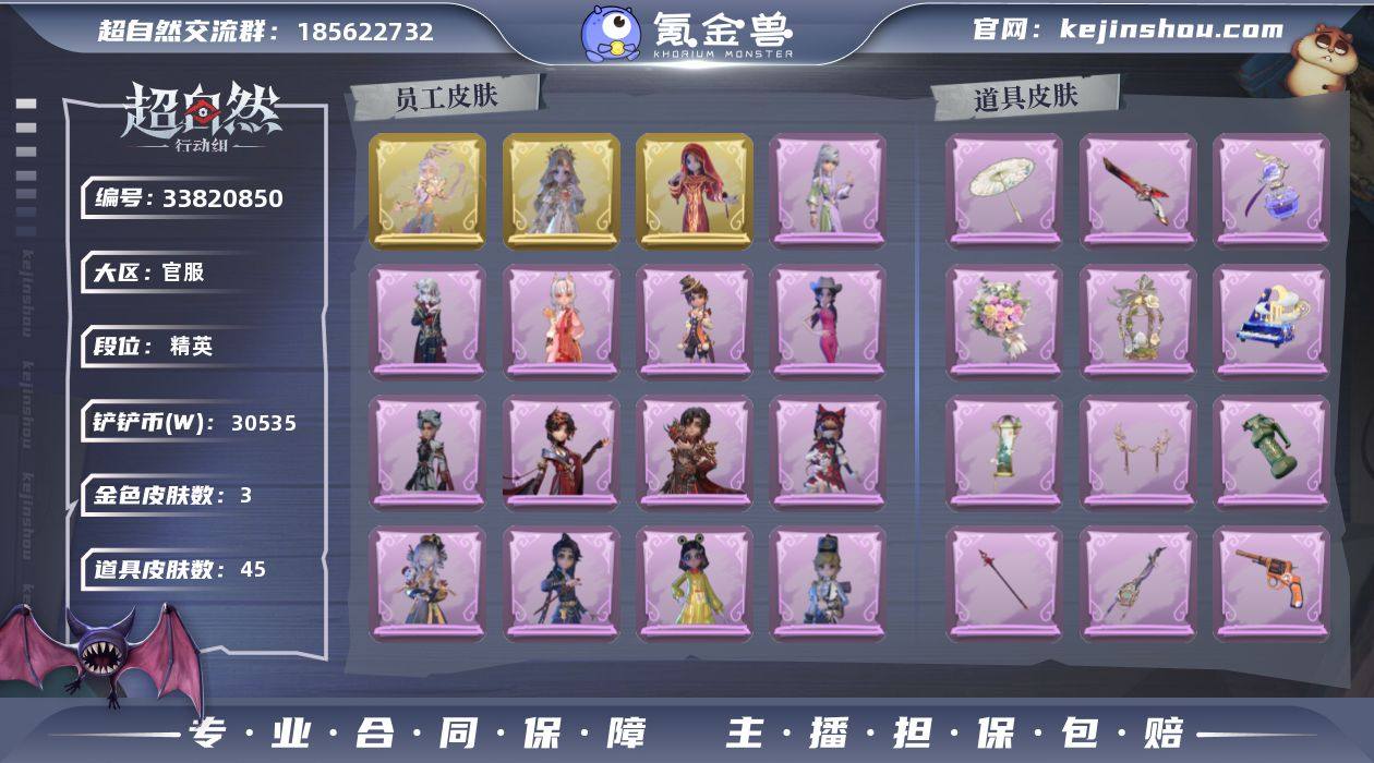 金皮3;紫皮19;道具皮45;皮肤:逍遥-莲华渡,巫铃儿-镜花辞,薇薇安-圣光之谕,逍遥-绣春逍影,薇薇安-仙锋小姐,莉莉-情公主,小黄-霓裳踏雪,逍遥-万迭云华,艾伦-黎明猎手,临云-织锦云程,爱丽丝-耀眼的你,薇薇安-白光莹,阿念-王子与骑士,巫铃儿-素影瑶光,莉莉-莓果陷阱,薇薇安-黑月挽歌,爱丽丝-丝缕哀歌,零-搬开山,阿念-庆宴绮愿,爱德华-梵卓之礼,莉莉-除妖小师妹,小黄-呱呱雨衣;道具:刺刀-小鲨匕首,铲子-赞萌波板糖,专业手电-花束般的告白,黄牛能量饮料-珍珠芭乐莓莓,短管猎枪-赞萌露比水枪,音响-happy猫,音响-咏叹调,额外的背包-飞花令,急救包-蔷薇物语,额外的背包-灵感泉之花,桃木剑-永眠曲,短管猎枪-安魂曲,摸金符-祝祷词,音响-月光奏鸣曲,葫芦-伏妖塔,夜视仪-心跳眼镜,桃木剑-小羊波德莱尔剑,黄牛能量饮料-无人岸,刺刀-碧络琅环,传送按钮-逆时审判,传送按钮-浮生一梦,长枪-罪棘,腰包-红运福虎,短管猎枪-星光的裁决,摸金符-花落精绝,夜视仪-金丝眼镜,喷气背包-乘风溯雪,长鞭-小狗蛇点点鞭,伞-郁金春信,铲子-龙鳞,音响-鸣沙鼓,长鞭-缚誓之锁,腰包-惊魂娃娃,闪光弹-金戈玄铜,传送按钮-幻宠之门,铲子-卡皮巴拉小黄豚铲,夜视仪-敛花容,专业手电-云端梦想计划,腰包-月下莲台,转...