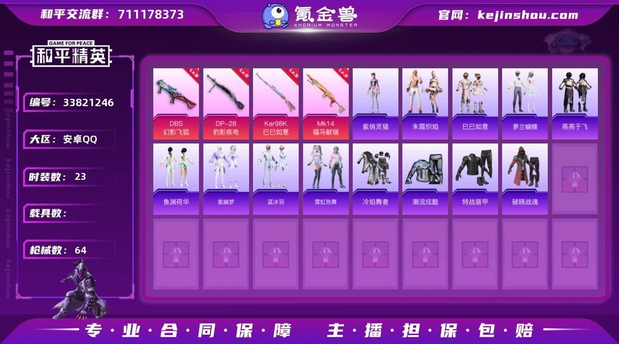 安卓 手Q-0粉装-4特效枪-0载具-0粉色飞行器-15582热力值-0王牌印记-23套装-64枪皮 【粉色枪皮等级】:Kar98K-巳巳如意(五级),Mk14-福马献瑞(三级),DBS-幻影飞狐(六级),DP-28-豹影疾电(五级) 【粉色枪皮】:Kar98K-巳巳如意,Mk14-福马献瑞,DBS-幻影飞狐,DP-28-豹影疾电 【粉色降落伞】:第五大道降落伞 【稀有套装】:套装-巳巳如意,套装-萝兰蝴蝶,套装-燕燕于飞,套装-鱼渊荷华,套装-紫幽梦,套装-蓝冰羽,套装-霓虹热舞,套装-朱霞炽焰,角色-紫俏灵猫 【稀有枪皮】:M416-红色方程式,M762-天降萌叽,G36C-星穹咏叹调,ARX-凌霄紫焰,UZI-啾咪啾咪,UZI-红色方程式,UZI-月影灵韵,UMP45-蓝色火焰,JS9-凌霄紫焰,M24-炫彩节奏,VSS-彩虹符号,S12K-智耀战神,MG3-幻世战舞者,MG3-第五大道,MG3-智耀战神,MG-36-凌霄紫焰,P92-凌霄紫焰,短管霰弹-星穹咏叹调,大砍刀-鬼刀,平底锅-凌霄紫焰 【其他套装】:套装-冷焰舞者,套装-潮流炫酷,套装-特战装甲,套装-破晓战魂 【营地ID】:997465507