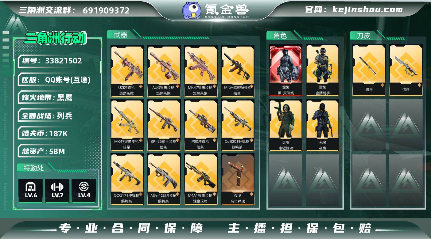 【sjs9893】包人脸 玩够能回血 2刀皮 一红皮 烽火地带段位: 黑鹰 全面战场段位: 列兵 总资产: 58000000 哈夫币: 187000 sjs9893 干员外观: 无名-夜鹰(S4),露娜-黑·天际线,红狼-电锯惊魂,露娜-金牌射手(S7) 传说武器皮肤: M4A1突击步枪-蚀金玫瑰,AK-12突击步枪-夜鹰,M4A1突击步枪-阿米娅,CAR-15突击步枪-阿米娅,复合弓-黑-天际线,AWM狙击步枪-捞点薯条,腾龙突击步枪-捞点薯条,93R-捞点薯条,AK-12突击步枪-特斯拉线圈,SR-3M紧凑突击步枪-特斯拉线圈,UZI冲锋枪-特斯拉线圈,勇士冲锋枪-能天使-午夜邮差,SCAR-H战斗步枪-启航,ASh-12战斗步枪-鹅鸭杀,QCQ171冲锋枪-鹅鸭杀,QJB201轻机枪-鹅鸭杀,KC17突击步枪-电锯惊魂,近战-信条,P90冲锋枪-信条,SR-25射手步枪-信条,SG552突击步枪-运动员,SKS射手步枪-骑士,近战-暗星,MK47突击步枪-暗星,SR-3M紧凑突击步枪-暗星,腾龙突击步枪-马年祥瑞,G18-马年祥瑞,勇士冲锋枪-万金泪冠,腾龙突击步枪-万金泪冠,AWM狙击步枪-万金泪冠,.357左轮-缄花,SR-25射手步枪-缄花,M14射手步枪-缄花 史诗武器皮肤: SVD狙击步枪-阿萨拉工艺,Vector冲锋枪-阿萨拉文明,S12K霰弹枪-曙光,沙漠之鹰-曙光,AUG突击步枪-蝮蛇,M700狙击步枪-蝮蛇,PKM通用机枪-蝮蛇,AKM突击...