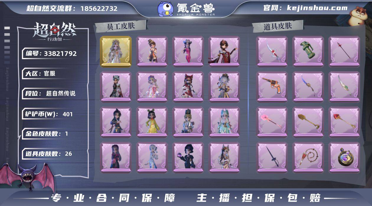 金色皮肤数量: 1 紫色皮肤数量: 15 道具皮肤数量: 26 段位: 超自然传说 员工: 逍遥,薇薇安,巫铃儿,莉莉,阿念,艾伦,小黄,零,爱丽丝,爱德华,兰,小满,临云 外观: 圣光之谕,王子与骑士,瑞羽衔春,丝缕哀歌,素影瑶光,黑月挽歌,白光莹,嘻嘻头套,烈焰红唇头套,呆滞头套,炙热烧烤,卑微头套,哈士奇头套,滑稽头套,鳄霸天头套,鱼头怪头套,面具马头套,萨卡班甲鱼头套,咬咬鲨头套,龙傲天头套,云梦之星,毛球夹子,天使的呼唤,蝶恋花,小鲨包包,未竟乐园,天使消失的年代,钗头凤,呱呱雨衣,绣春逍影,除妖小师妹,小财神豚豚头套,九色祥鹿,火爆了头套,精致露比头套,惊魂南瓜,莓果陷阱,甜梦派对,樱桃奶油布丁,仙锋小姐,暗夜小恶魔,雪墩墩头套,太空鲨头套,黎明猎手,耀眼的你,庆宴绮愿,晚安小熊,烛光纪念,醉花阴,拂云仙,不朽的今夜,牛啤背包,饺饺者头套,夜浮船,园丁鲨鲨头套