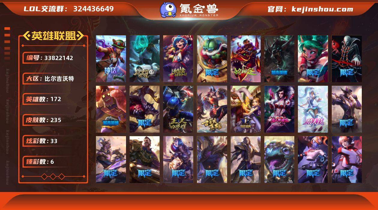 未定级段位-172英雄-235皮肤-33炫彩-0终极-3神话-38限定-19传说-74史诗 【神话皮肤】:十周年纪念安妮,源代码乐芙兰,十五周年纪念希维尔 【臻彩皮肤】:冠军之刃锐雯2016凯旋圣装,神龙尊者圣龙李青登龙,黎明使者锐雯黑夜使者,魔女阿卡丽虚荣,净雪之月莫甘娜冬虹 【年限皮肤】:神龙之翼库奇 【情人节限定】:觅心猎手薇恩,水晶玫瑰迦娜 【冰雪限定】:圣诞狂欢努努和威朗普,圣诞糖果棒厄运小姐,胡桃夹子萨科,邪恶圣诞老人维迦,夺命美人卡特琳娜,圣诞驯鹿克格莫,魄罗骑士瑟庄妮,冰雪节辛吉德 【限定皮肤】:诺斯费拉图弗拉基米尔,暗杀星奥莉安娜,暗杀星伊泽瑞尔,SSW辛吉德,SSW图奇,SSW雷恩加尔,安妮梦游仙境,暗裔英雄盖伦,胜利枪神格雷福斯,胜利女神奥莉安娜,胜利之剑亚托克斯,胜利枪神卢锡安,胜利巨口克格莫,胜利剑圣易,胜利之运崔斯特,胜利女神菲奥娜,鬼影森森茂凯,泳池派对塔里克,蒙多蒙多,外星装甲库奇,暗影沃里克,波比的巧克力工坊,勇者阿狸,都铎王朝图奇,玉剑传说舞龙卫,防暴天使凯尔 【传说皮肤】:铁哥们儿奥拉夫,大天使长米迦勒凯尔,战场女武神凯尔,钢铁之翼凯尔,提莫约德尔人的一大步,约德尔国队长提莫,合金巨兽努努和...