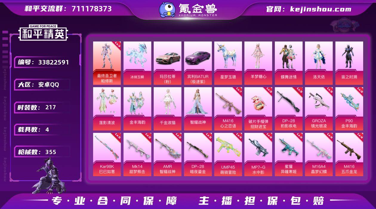 【LHPX2265】扭蛋碎片3261 【特价出售/店主推荐】安卓 手Q-1神装-8粉装-20特效枪-4载具-9粉色飞行器-113844热力值-19王牌印记-217套装-355枪皮【红色神装等级】:最终圣卫者-帕修斯(三级)【热门品类】:套装-浪漫天命,套装-小丑鱼,套装-龟仙人,套装-暗影哥特,角色-8号机,角色-Mark.06【粉色套装】:粉装-蝶舞迷情,角色-洛天依,角色-宙之时溯,粉装-莲影清波,粉装-金丰海韵,角色-千金淑猫,角色-智耀战神,角色-羊梦糖心【粉色枪皮等级】:AKM-幽焰骑士(三级),M16A4-晶梦幻蝶(四级),M416-五爪金龙(四级),M416-心之恋语(七级),GROZA-镜光银凌(五级),蜜獾-异瞳寒姬(四级),UMP45-萌骑冒险(四级),Vector-最终圣卫者(三级),MP7-G-水中影(四级),P90-金丰海韵(五级),Kar98K-巳巳如意(五级),M24-镜域双华(三级),Mk14-甜梦熊击(五级),Mk14-福马献瑞(三级),AMR-智耀战神(五级),DP-28-暗夜鎏金(五级),DP-28-豹影疾电(五级),MG3-洛神天依(四级),MG-36-幻彩电音(四级),破片手榴弹-招财进宝(五级)【粉色载具】:玛莎拉蒂Ghibli(粉),宾利BATUR(极速紫),星梦玉骢,冰绡玉鳞【粉色枪皮】:AKM-幽焰骑士,M16A4-晶梦幻蝶,M416-五爪金龙,M416-心之恋语,GROZA...