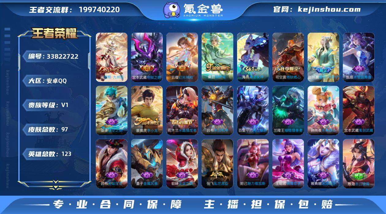 【裸澜愿照九州拓】安卓Q-V0-永恒钻石II段位-123英雄-97皮肤-4传说-18史诗 【英雄全皮】:敖隐全皮 【传说皮肤】:澜愿照九州拓,云缨幻光神枪,桑启鸣野蒿,宫本武藏地狱之眼 【限定皮肤】:姜子牙天穹之誓,狄仁杰阴阳师,高渐离玩趣恶龙,项羽海滩派对,兰陵王金庭之子,李元芳云中旅人,沈梦溪大漠名商,裴擒虎李小龙,裴擒虎擒涛扼浪,鲁班大师探海日志,桑启海盐诗旅,艾琳流音漫舞,司空震地狱燃心,张良古海寻踪,沈梦溪龙舞盛年,周瑜熔金海岸 【年限皮肤】:澜愿照九州拓 【赛季限定】:兰陵王金庭之子,沈梦溪大漠名商,李元芳云中旅人,桑启海盐诗旅,裴擒虎擒涛扼浪,鲁班大师探海日志,张良古海寻踪,姜子牙天穹之誓,东皇太一噬灭天穹,太乙真人谧流熔炉,甄姬逆浪荇歌 【战令限定】:司空震地狱燃心,艾琳流音漫舞,亚连破空之剑,孙悟空神迹守卫 【史诗皮肤】:海月海之女神,赵怀真器灵浮梦炉,亚连破空之剑,司空震地狱燃心,裴擒虎李小龙,百里守约特工魅影,雅典娜冰冠公主,兰陵王暗隐猎兽者,花木兰水晶猎龙者,张飞乱世虎臣,吕布末日机甲,吕布圣诞狂欢,墨子金属风暴,妲己魅力维加斯,孙尚香水果甜心,宫本武藏鬼剑武藏,王昭君偶像歌手,甄姬冰雪...